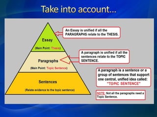 The document provides a comprehensive guide on writing essays, covering essential elements such as introductions, conclusions, topic sentences, and the importance of a clear thesis. It emphasizes effective planning, using outlines, and critical reading strategies to strengthen arguments and engage readers. Additionally, it highlights the significance of addressing counterarguments and revising extensively to improve clarity and coherence in writing.