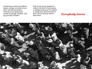 - People learn what they want to learn, not always what others try to teach them. This is illustrated through an anecdote about a dog learning from its owner's behavior, rather than the owner's intended lesson.