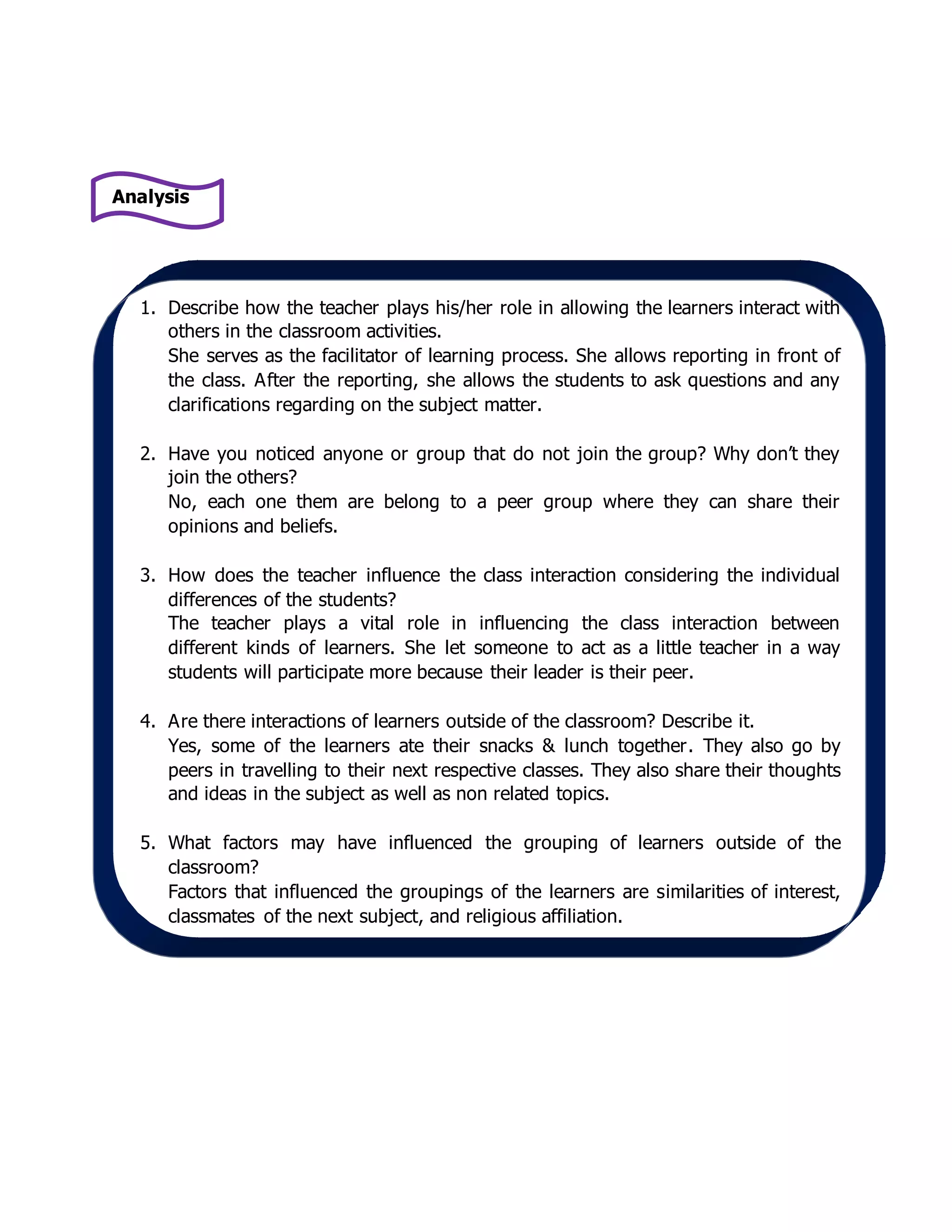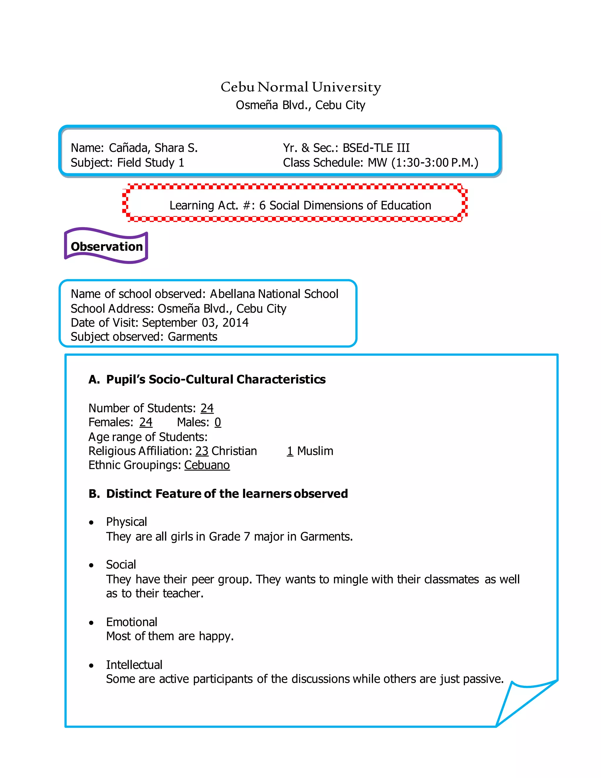 This document summarizes a classroom observation at Abellana National School. It describes the students observed as 24 female Grade 7 students studying garments, who were mostly Christian with one Muslim student. It notes that socially the students had peer groups and wanted to mingle with classmates and teachers, and emotionally most were happy. It analyzes how the teacher facilitates learning and allows student participation and questioning, and how students interact outside of class in their peer groups during breaks. It reflects that the teacher encourages unity and active learning, and ways to improve would be encouraging more passive students and using varied materials to engage different learners and encourage interaction regardless of backgrounds.