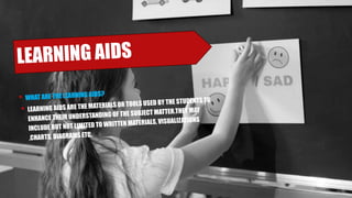 This document discusses various learning aids that are important for learning physics, including both formal aids like textbooks, handbooks, sourcebooks, workbooks, and reference books, as well as improvised aids made by teachers and students. It provides details on the need for and importance of learning aids in motivating students and helping them retain concepts. It also describes the key qualities and features of different formal learning aids like what should be included in textbooks, handbooks, sourcebooks, workbooks, and reference books. Supplementary reading materials and community resources are also mentioned.