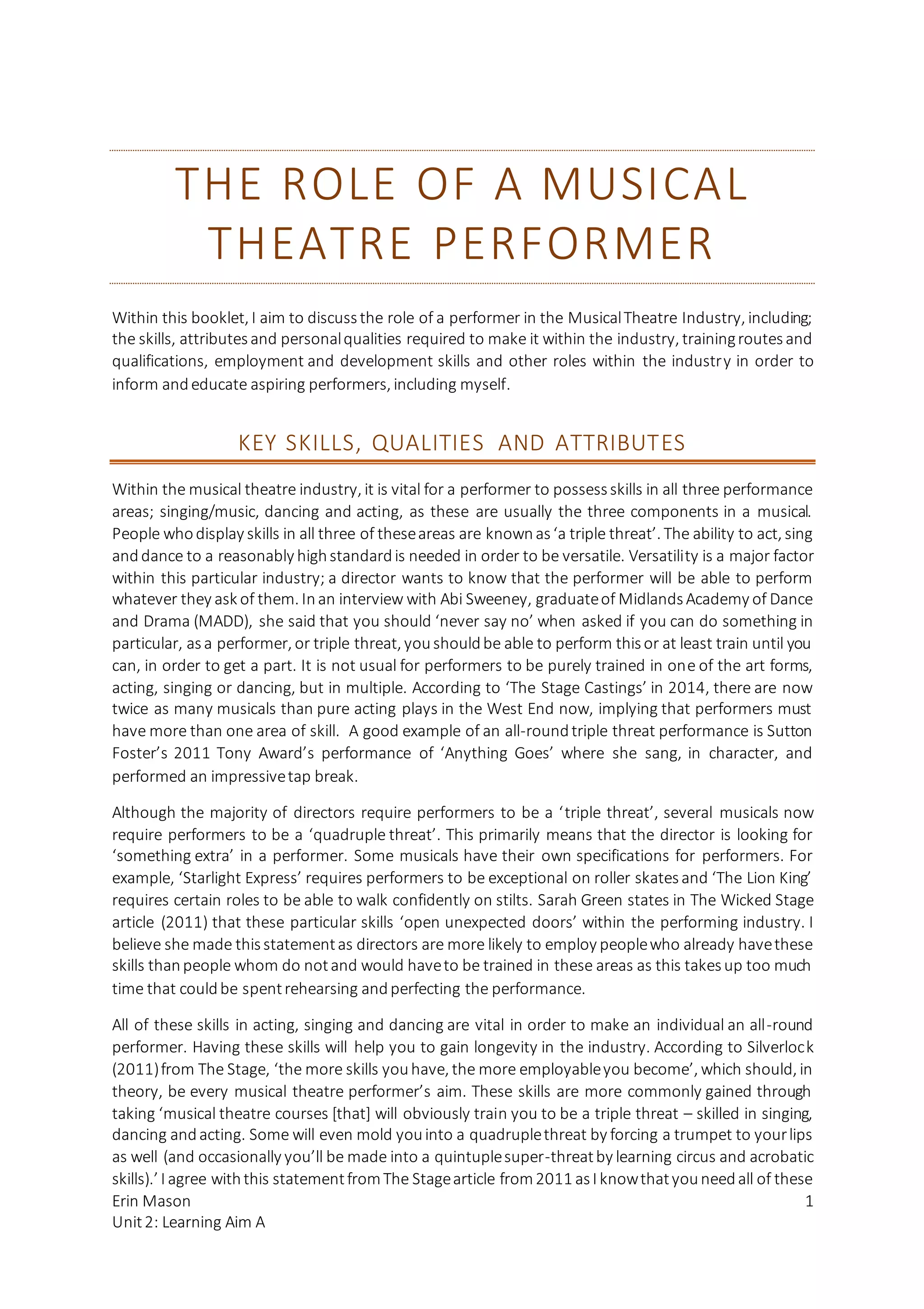 This document discusses the skills required to be a successful musical theatre performer. It states that performers must be triple threats, having strong skills in singing, dancing, and acting. They must also have other qualities like versatility, professionalism, and the ability to learn choreography quickly. The document then examines the specific skills needed for dancing, singing, and acting in musical theatre. It emphasizes the importance of techniques like characterisation, breath control, flexibility, and projecting the voice. Overall, the document provides an overview of the roles and responsibilities of a musical theatre performer.