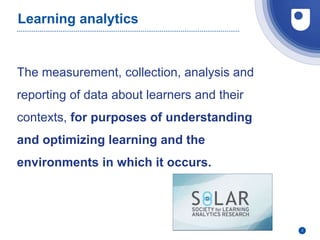 The document discusses learning analytics, highlighting its role in the measurement and optimization of learning environments and learner outcomes. It outlines priority areas such as open education, supporting educators, and enhancing employability through data analysis while raising ethical concerns regarding data privacy and learner autonomy. The text suggests a need for a collaborative approach across various educational sectors to develop effective learning analytics frameworks and infrastructure.