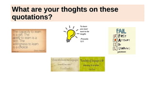 This document discusses various topics related to learning and education, including learning English, international English, common frustrations learners face, and improving one's command of the language. It presents several quotations to reflect on and statements about different types of learning. It also includes passages about school levels and subjects in British and American English and matching idioms and phrases to their definitions. Finally, it poses questions about international English and overcoming language barriers.