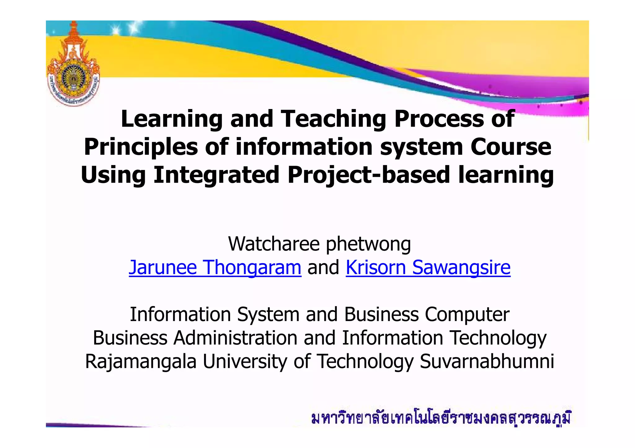 This document discusses using an integrated project-based learning approach to teach principles of information systems courses. It begins by explaining the motivation and benefits of project-based learning according to the National Education Act of 1999 and learning pyramid theory. The objectives are then presented to develop a teaching and learning process for the course using project-based learning.