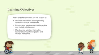 Learning and thinking styles describe an individual's preferred way of processing information, such as visual, auditory, or kinesthetic learning. Multiple intelligences, a theory by Howard Gardner, propose that people possess several distinct types of intellectual abilities, including verbal-linguistic, logical-mathematical, and bodily-kinesthetic intelligence. While related, learning styles focus on preferences, whereas multiple intelligences emphasize abilities and strengths that can be developed