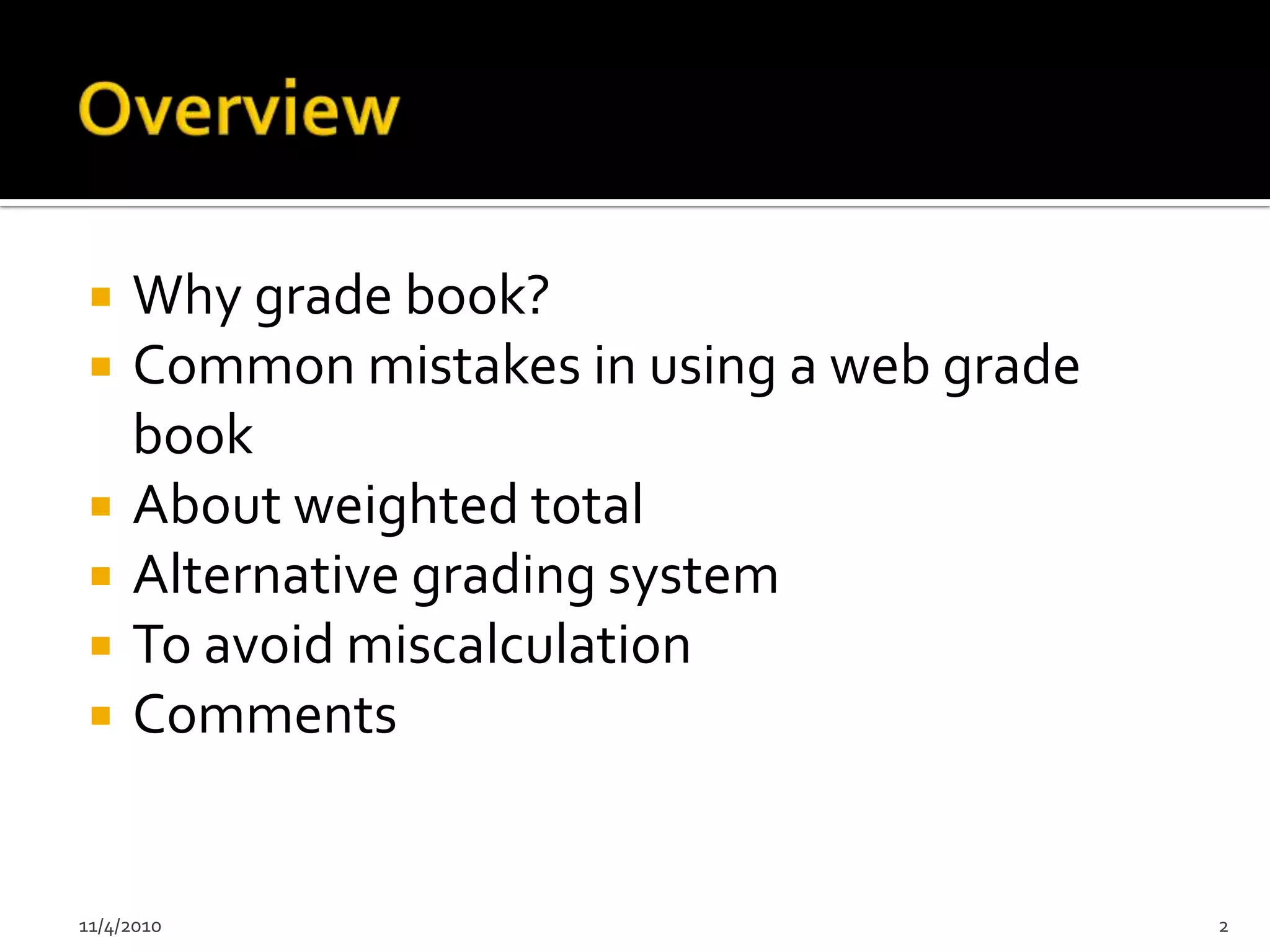 This document discusses common mistakes instructors make when using online grade books for courses with a learning management system. It provides tips to avoid miscalculating grades due to issues with weighted categories, duplicate schemas, special characters, and other problems. The key recommendations are to carefully plan the grade book structure, understand how the grade book software calculates weights and totals, and verify grades with an external spreadsheet if needed.