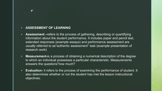 This document discusses different concepts related to assessment of learning. It defines assessment, measurement, evaluation, tests and testing. It describes norm-referenced tests which compare students to others and criterion-referenced tests which measure students against a set standard. The document also discusses placement, diagnostic, formative and summative assessment, as well as traditional, performance and portfolio modes of assessment. It provides characteristics of well-written instructional objectives and factors to consider when constructing good test items.