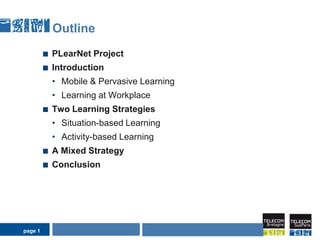 This document discusses pervasive learning at the workplace using a mixed strategy of situation-based and activity-based learning. It proposes combining the two strategies to overcome some of their individual drawbacks and better handle a variety of situations and activities. The key aspects of the mixed strategy are: