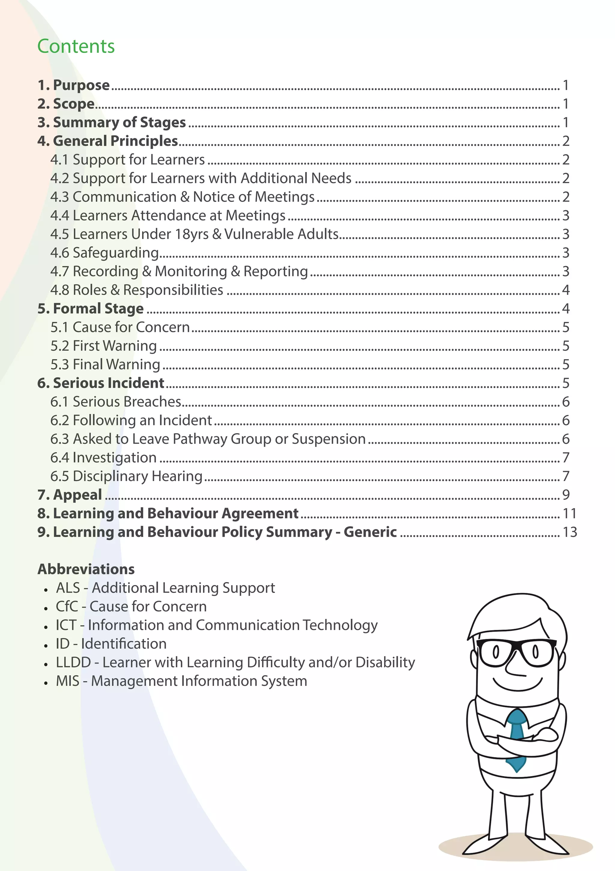 This document outlines a learning and behavior policy for Pathway College. It describes a formal stage process and serious incident process for addressing breaches of the learning agreement. The formal stage has three levels - cause for concern, first warning, and final warning - which are used to address minor breaches. More serious breaches are handled through a serious incident process involving investigation and potential disciplinary hearing. The policy provides guidance on communication, support, record keeping, and roles for staff and learners.