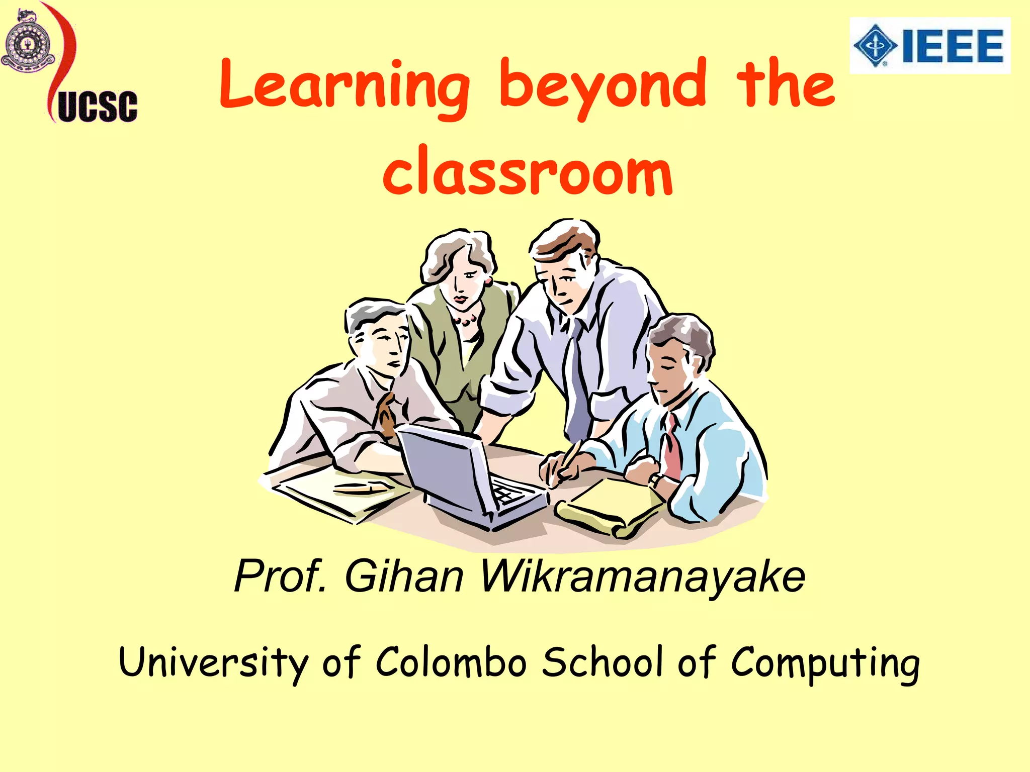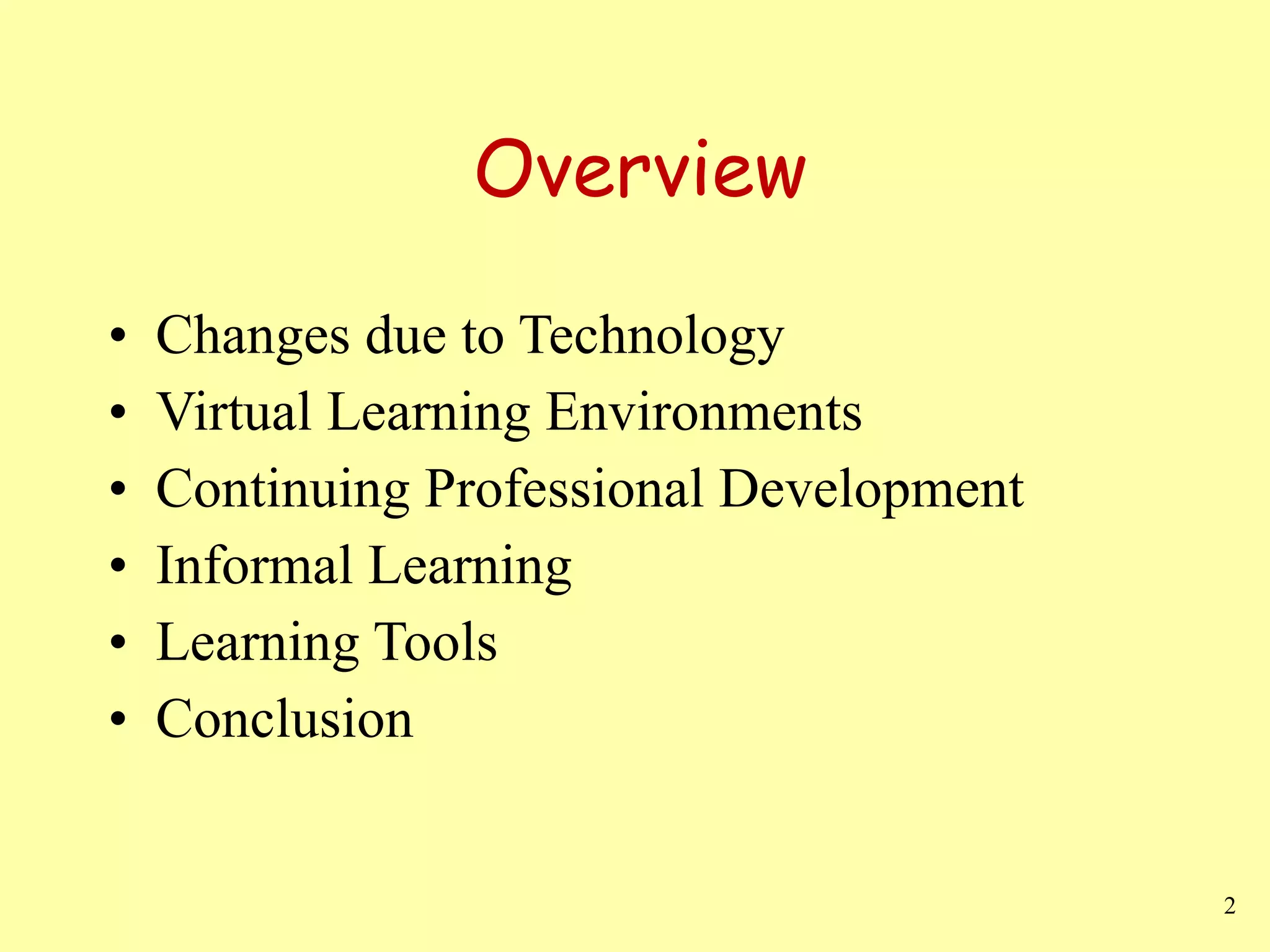 The document discusses the transformative impact of technology on education, highlighting shifts from traditional teaching methods to learner-centered approaches facilitated by virtual learning environments. It emphasizes the importance of continuing professional development and the role of informal learning through Web 2.0 technologies in adapting to societal changes. The conclusion underscores the necessity of lifelong learning and the ability to leverage technological advancements for career progression.