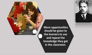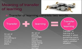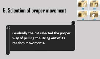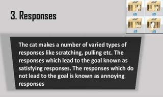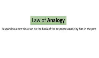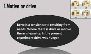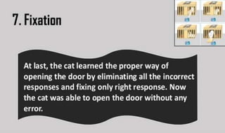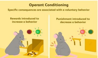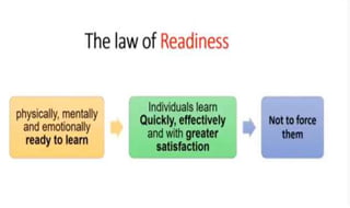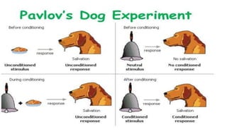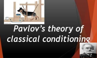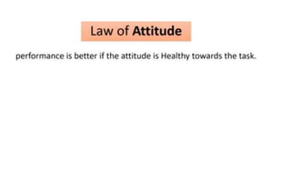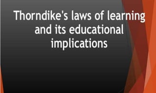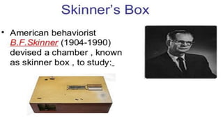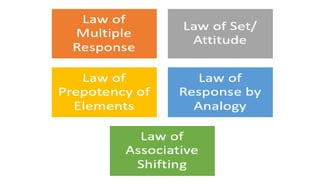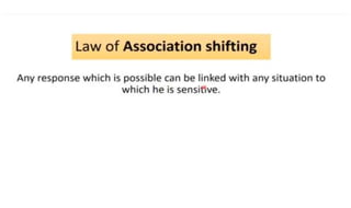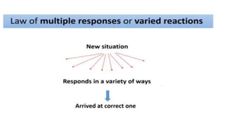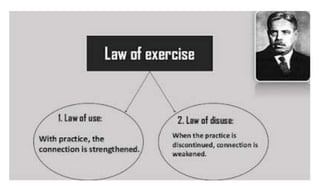 Learning can be defined as a relatively permanent change in behavior resulting from experience. There are several theories and laws of learning. Thorndike's law of effect states that behaviors followed by satisfying consequences are more likely to be repeated, while behaviors followed by unpleasant consequences are less likely to be repeated. Pavlov's classical conditioning theory explains how behaviors can become reflexive through repeated pairing with stimuli. Skinner's operant conditioning theory proposes that behaviors are shaped by their consequences - behaviors followed by reinforcement increase in frequency.