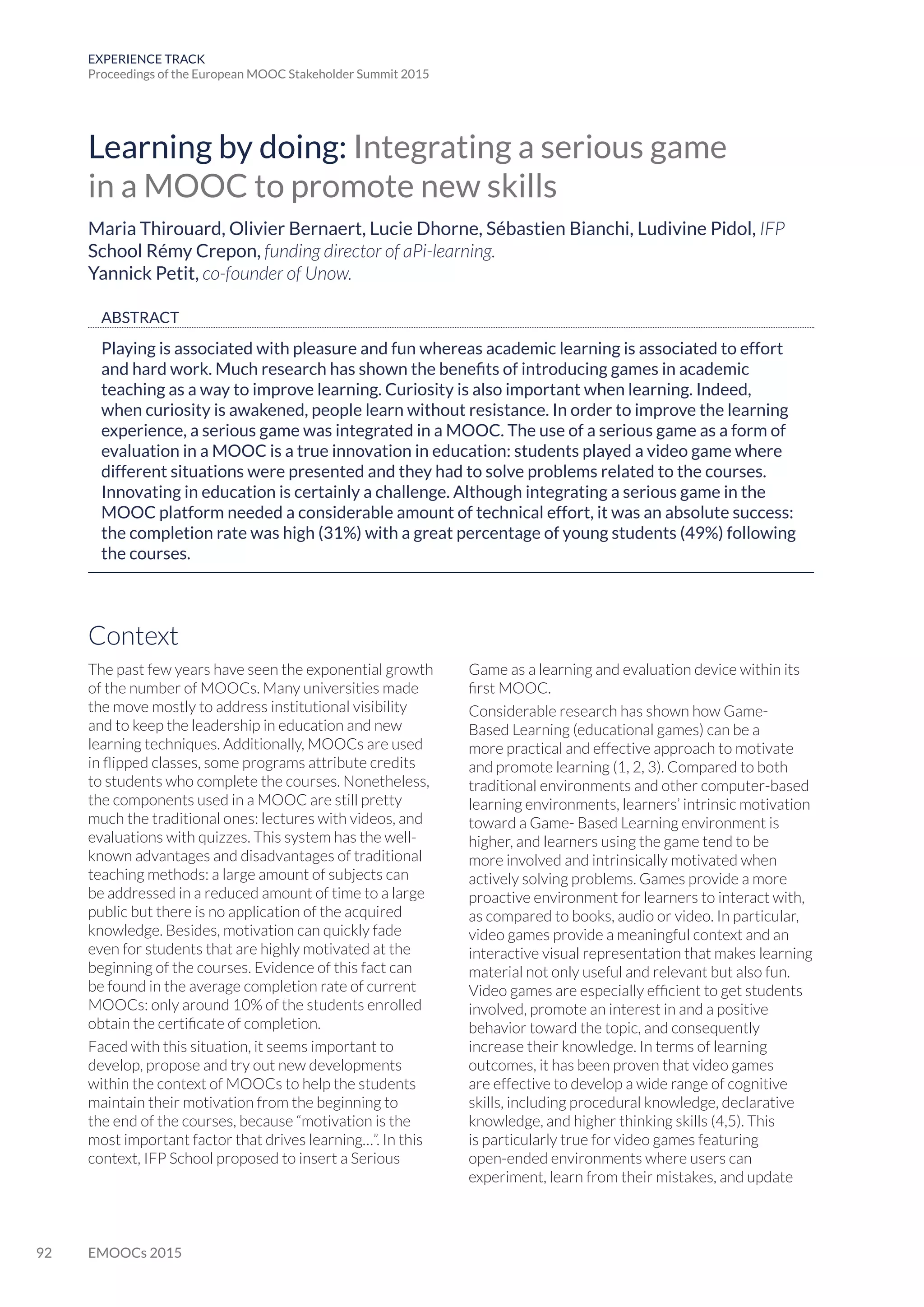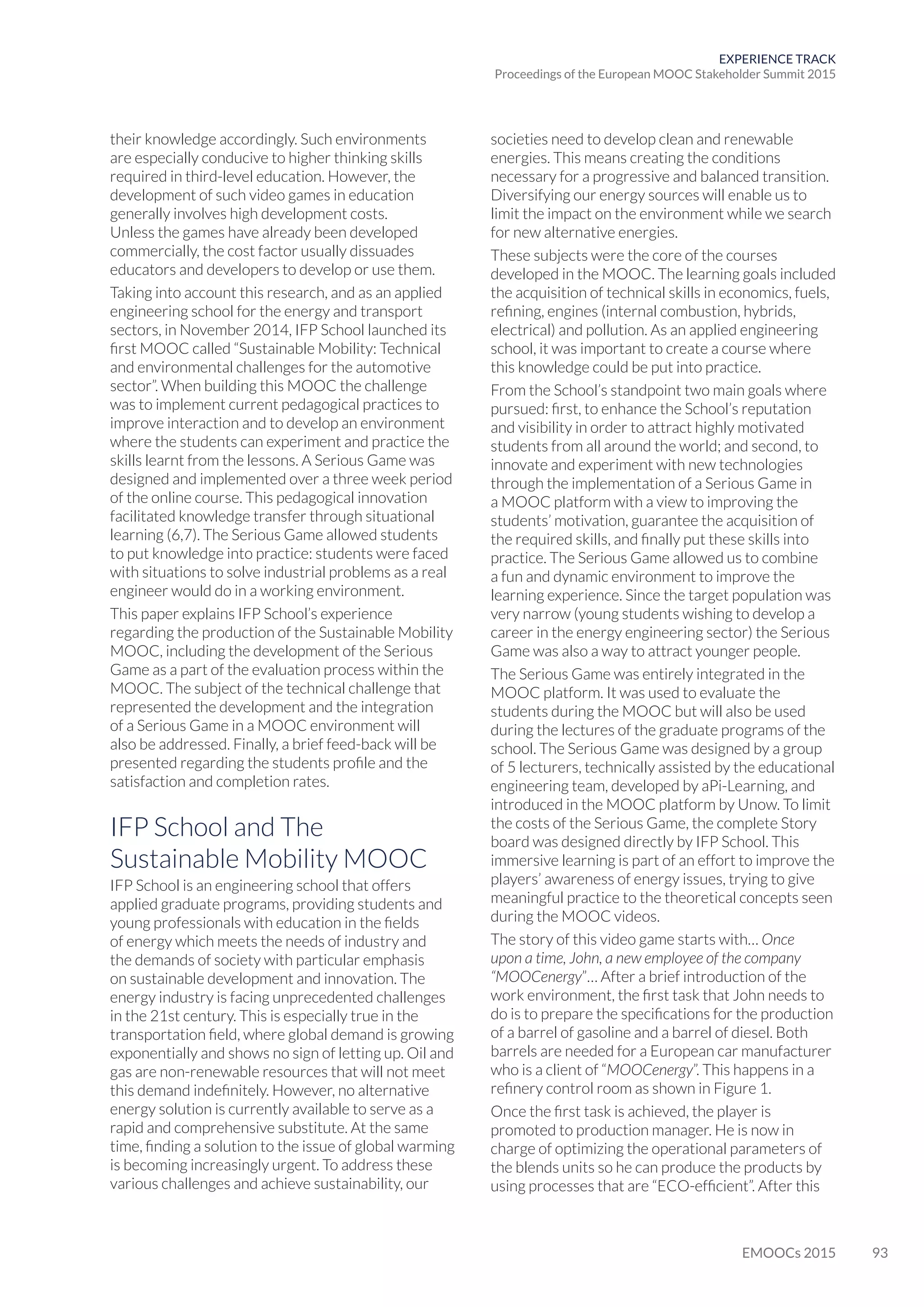 This document discusses integrating a serious game into a MOOC on sustainable mobility offered by IFP School to improve student motivation and learning. A serious game was developed where students took on roles like a refinery manager and solved industry problems. This allowed students to apply concepts from lectures in a fun, interactive way. Integrating the game technically with the MOOC platform was challenging but successful. The MOOC saw higher completion rates than average (31% vs 10%) and more young students (49% vs 15-19%), indicating the game was highly engaging and effective for learning. Student feedback confirmed the game improved understanding by allowing practical application of concepts in a low-stress environment.