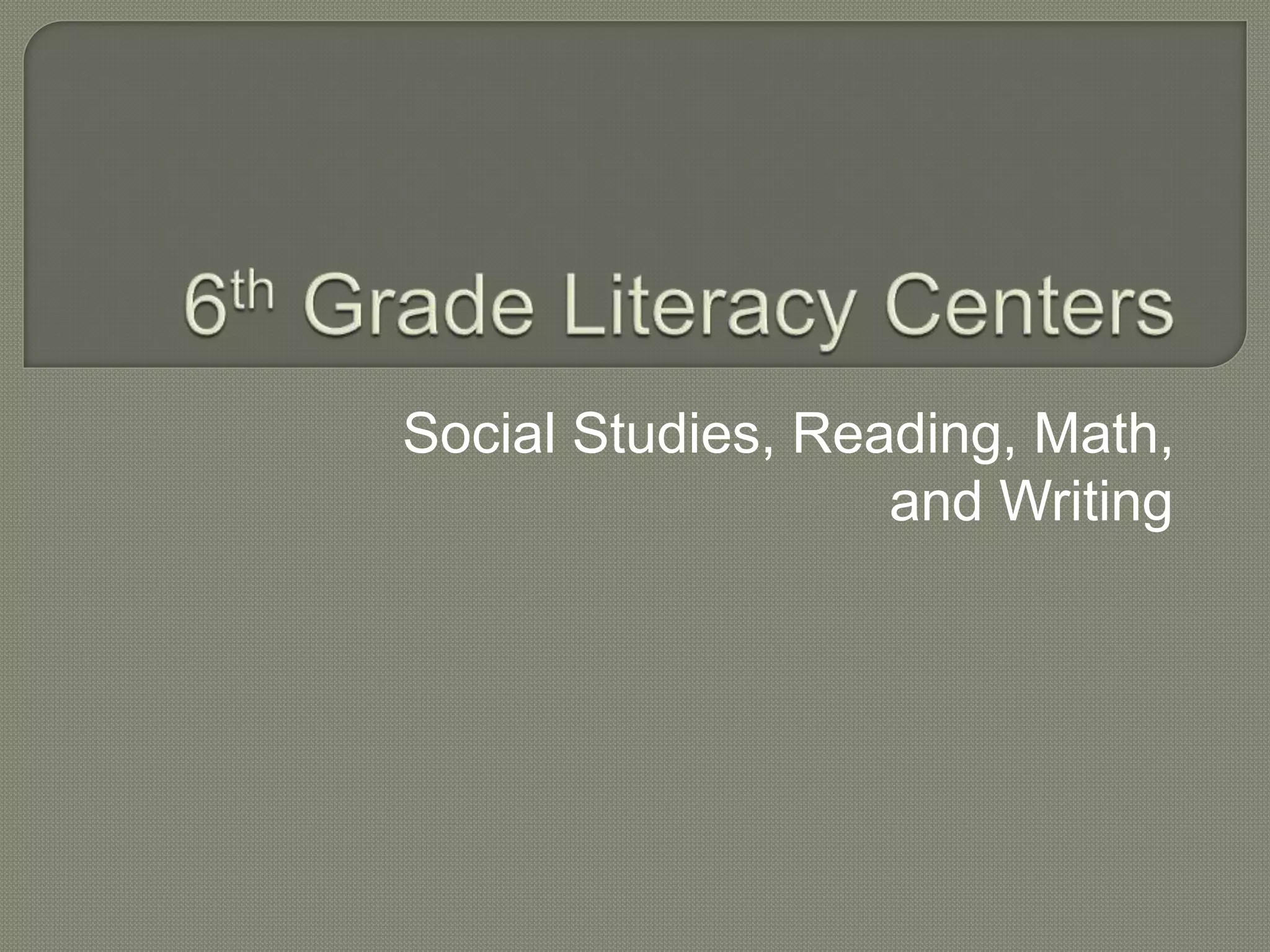 The document outlines centers for various subjects including reading, writing, math and social studies. The reading center includes activities like writing in journals about books, completing book summaries, and categorizing genres. The writing center features writing prompts and poetry activities. The math center offers games and extra practice problems. The social studies center plans to use books, maps and a project to teach students about Ancient Egypt. All centers are designed to be engaging and accommodate different ability levels.