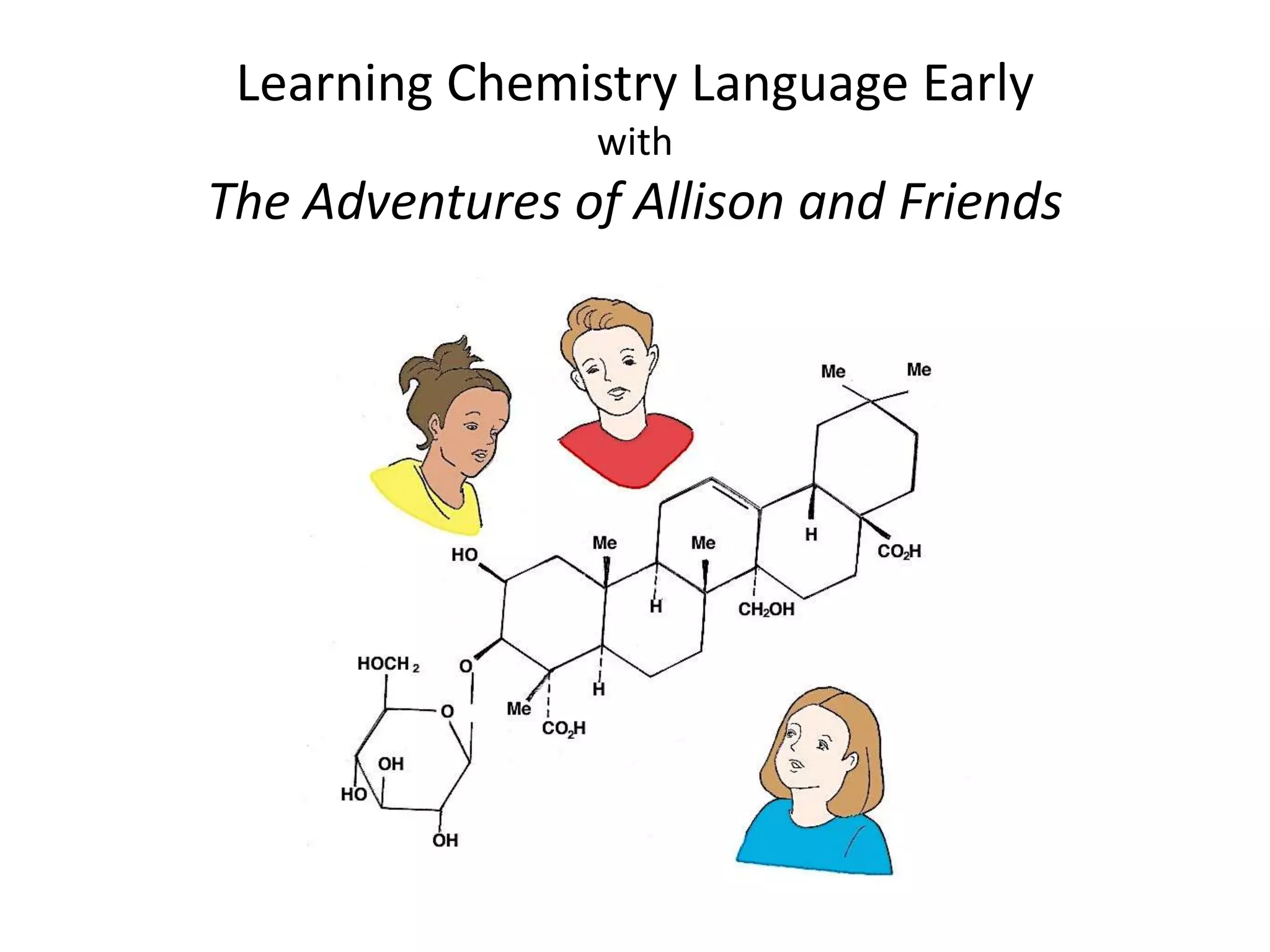 The document discusses the importance of storytelling and engagement in learning chemistry, using the comic series 'The Adventures of Allison and Friends' to illustrate chemical concepts as a natural language. It provides examples of various chemical structures and their contexts, emphasizing how such narratives can enhance understanding and retention. Key figures such as Seymour Papert and Albert Einstein are referenced to support the notion that imagination and emotional connection are vital to education.