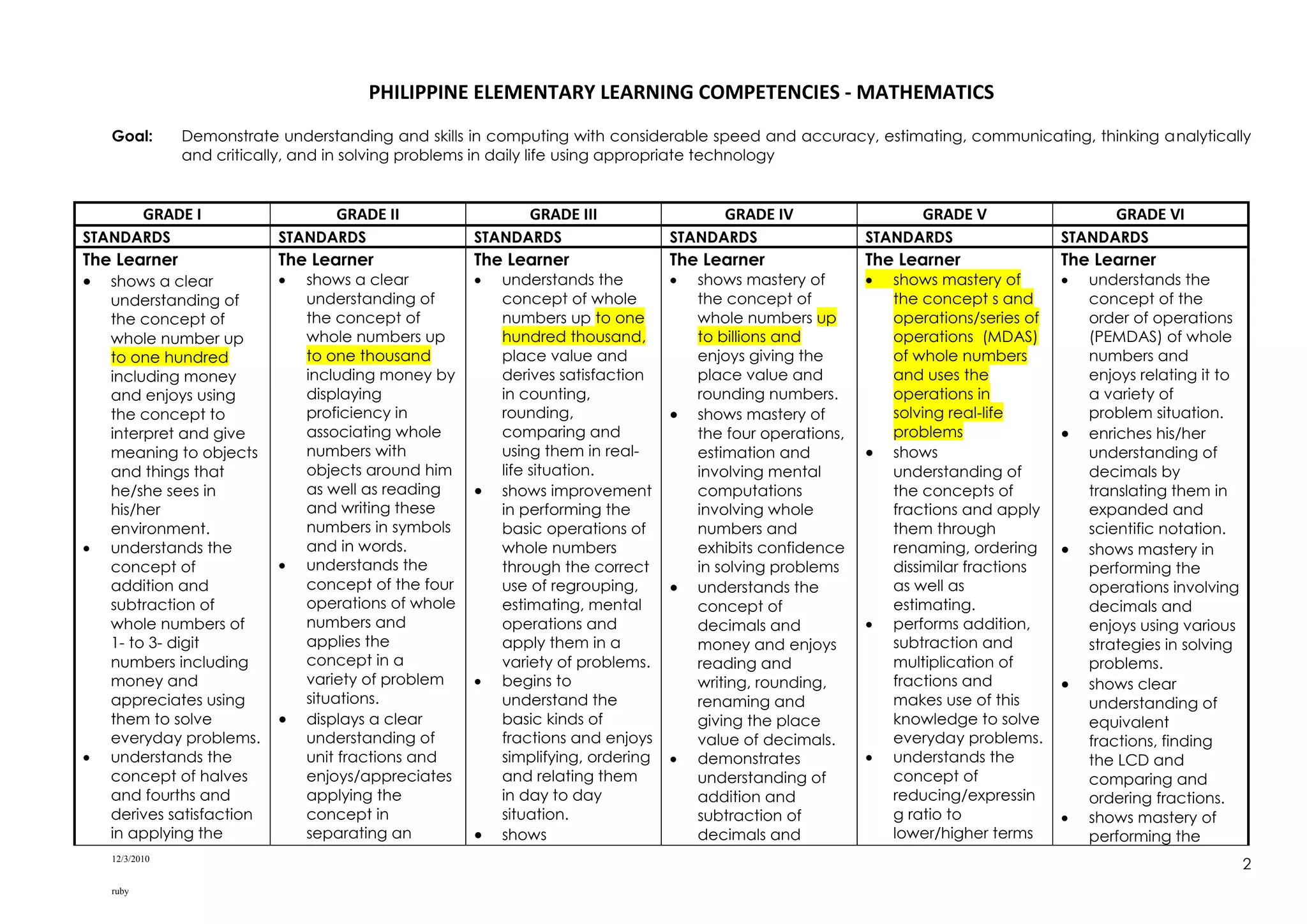 This document outlines the Philippine Elementary Learning Competencies for Mathematics for grades 1 through 6. It provides the standards and expectations for student understanding of key mathematical concepts like whole numbers, operations, fractions, decimals, measurement, and data analysis at each grade level. The goal is for students to demonstrate understanding, speed and accuracy in computations, estimating, problem solving, analytical thinking, and applying mathematics to daily life.