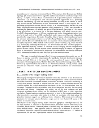 This paper presents a text categorization approach that combines relation extraction and context discovery techniques, demonstrating improved performance over traditional methods. Using the Reuters 21578 dataset and synthetic sports data, the authors highlight how learned contexts enhance categorization effectiveness. The document outlines the algorithm for training models and learning contexts and includes experimentation results comparing their method to existing algorithms.