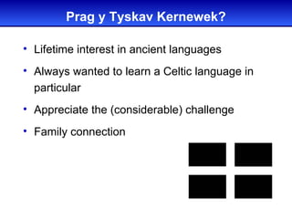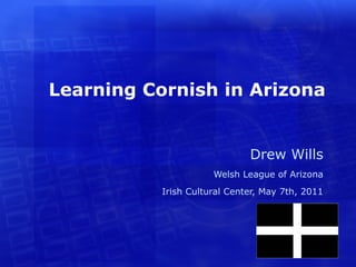 Drew Wills gave a presentation about learning Cornish in Arizona. He has had a lifelong interest in Celtic languages and wanted to learn Cornish in particular. Cornish originated in Cornwall in southwest Britain and was once widely spoken there, but died out by the 18th century. There have been efforts since the early 1900s to revive the language. Wills discussed the history and features of Cornish, including its spelling systems and vocabulary. He concluded by providing his contact information for anyone interested in learning more.