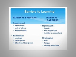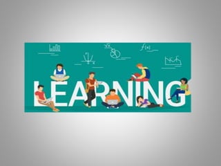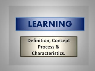 The document discusses the concept and process of learning. It defines learning as a change in behavior that results from direct or indirect experiences. The learning process involves three key elements - a motive or drive, an attractive goal, and a block or obstacle to achieving the goal. The process of learning includes setting goals to satisfy needs and motives, and overcoming barriers to attain those goals through new behaviors, knowledge, or skills. Finally, the document outlines several characteristics of learning, such as it being a continuous lifelong process, purposive, transferable between situations, and helping to bring desirable changes in behavior.