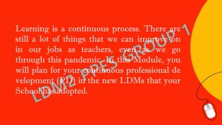 This document provides information about Module 4 which focuses on planning for continuing professional development and participating in a Learning Action Committee session. The objectives are to carry out a professional development plan using available DepEd or non-DepEd programs and resources, discuss initiatives with colleagues, develop an individual learning action plan, and commit to professional growth. The module includes lessons on self-reflection of capabilities and practice, and creating a realistic professional development plan to address identified needs related to teaching modalities and standards.