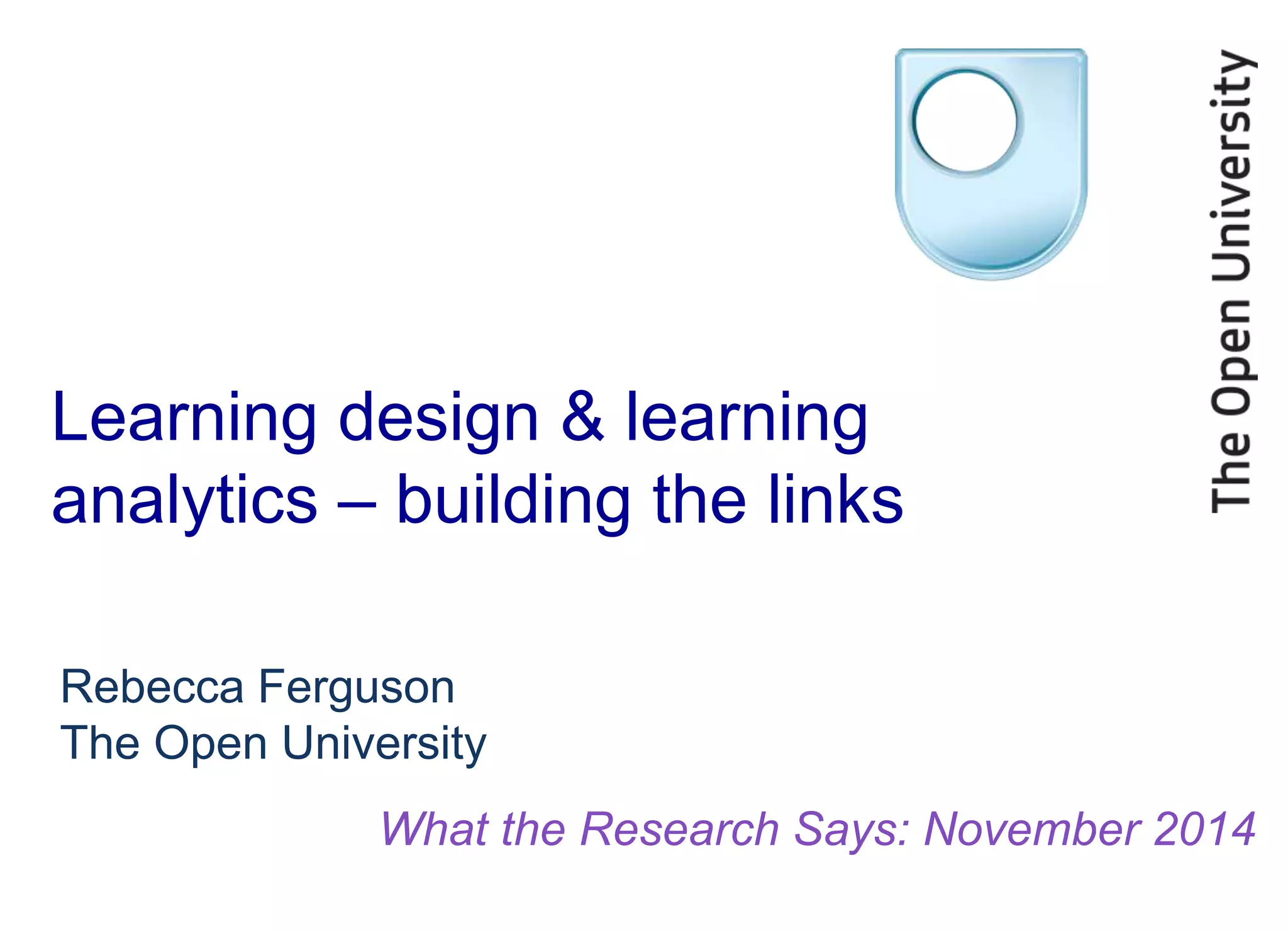This document discusses the relationship between learning design and learning analytics. It argues that learning design provides context that helps frame analytics questions and identify appropriate analysis. A MOOC planner is presented that prompts designers to plan different activity types like delivered content, reflection, collaboration, and assessment. Analytics can then provide insight into how learners engaged with those different activities. The document also discusses clustering analysis of learner engagement patterns in MOOCs, like samplers, strong starters, mid-way dropouts, and keen completers. Engagement patterns can vary based on pedagogy and learning design.