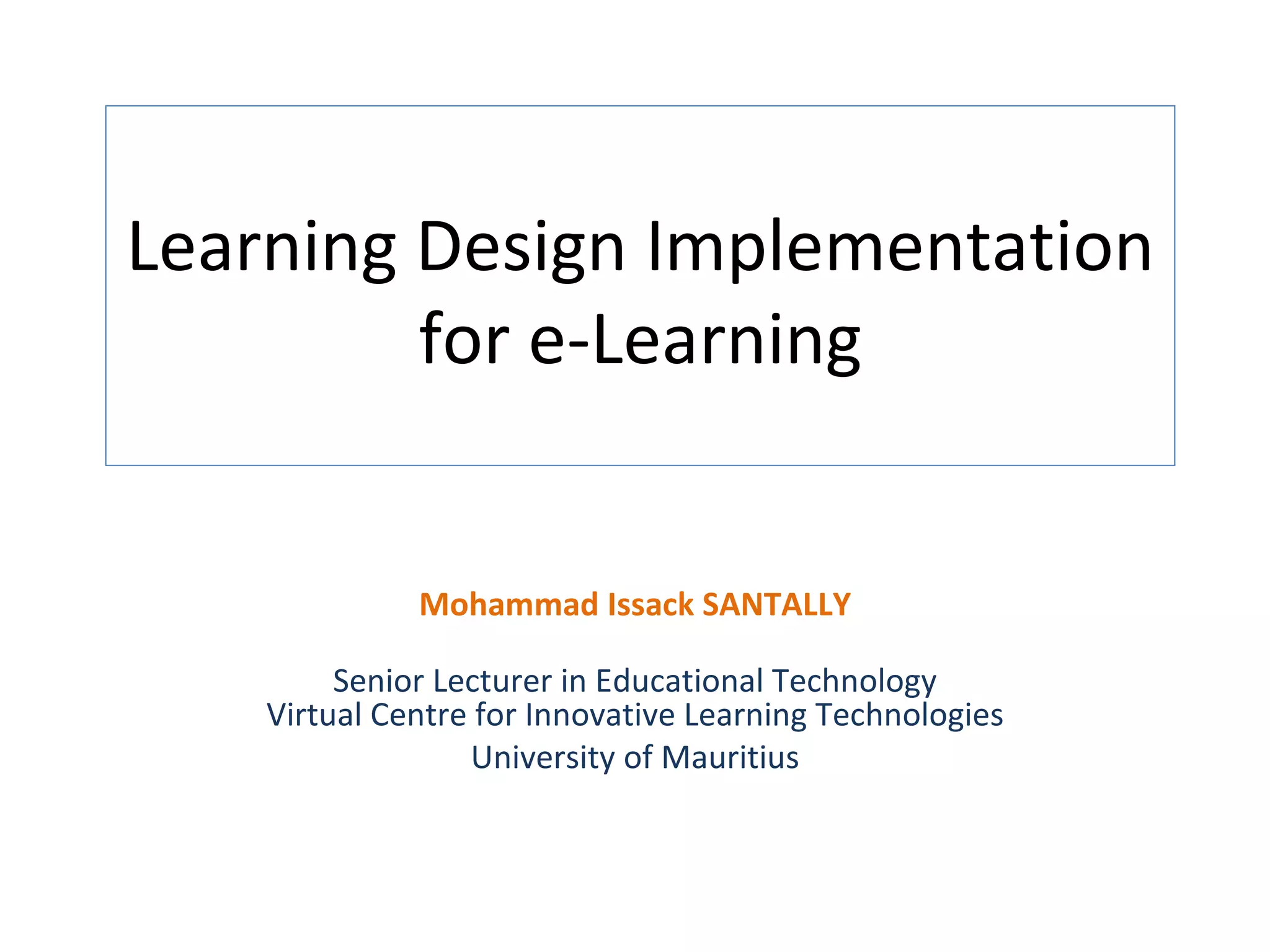 The document discusses the implementation of learning design in e-learning, focusing on the defining features and systemic approaches of distance education, including the teacher-student-content relationship. It highlights the importance of mediation and interaction in distance education and contrasts traditional and innovative pedagogical approaches. Additionally, the document emphasizes the potential of various e-learning authoring tools, particularly PowerPoint, to enhance learning experiences.