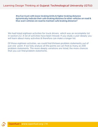 This document outlines the steps of design thinking including empathy, ideation of user activities and problem identification, solution identification, product development considering people, purpose and experience, functions and features, components and prototyping. It provides examples for ideation stages and appendices with ideation, product development and summary canvases as well as additional learning materials from Stanford D.School on design thinking.