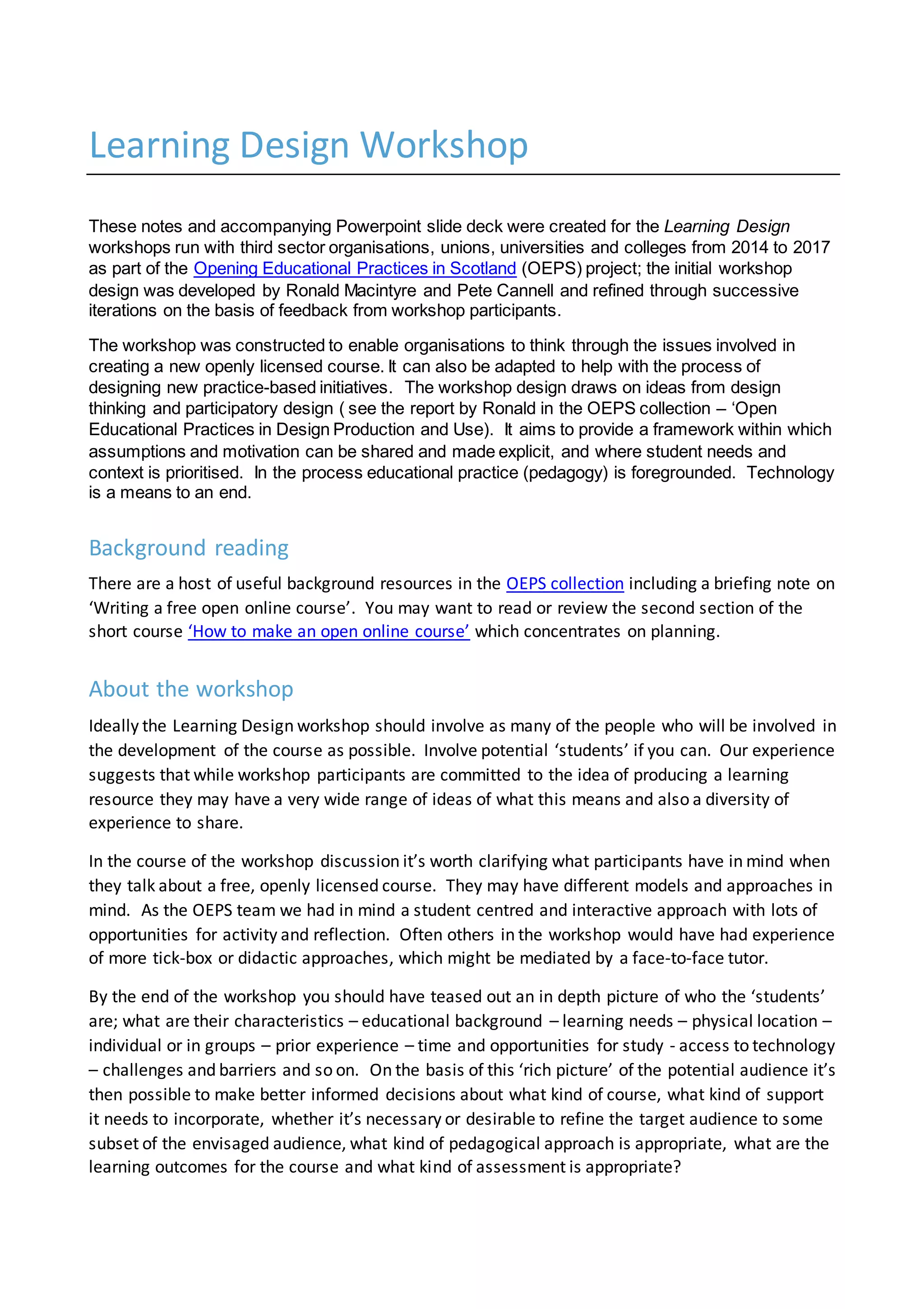 The document provides guidance for running a learning design workshop to help organizations design new openly licensed courses or educational initiatives. The workshop is intended to help participants understand learner needs and contexts in order to prioritize educational practice and pedagogy over technology. It involves exercises to characterize ideal and actual learners, map their experiences, and sketch a learner journey to determine learning outcomes, content, and assessment. The goal is for participants to make informed decisions about course design grounded in an in-depth understanding of learners.