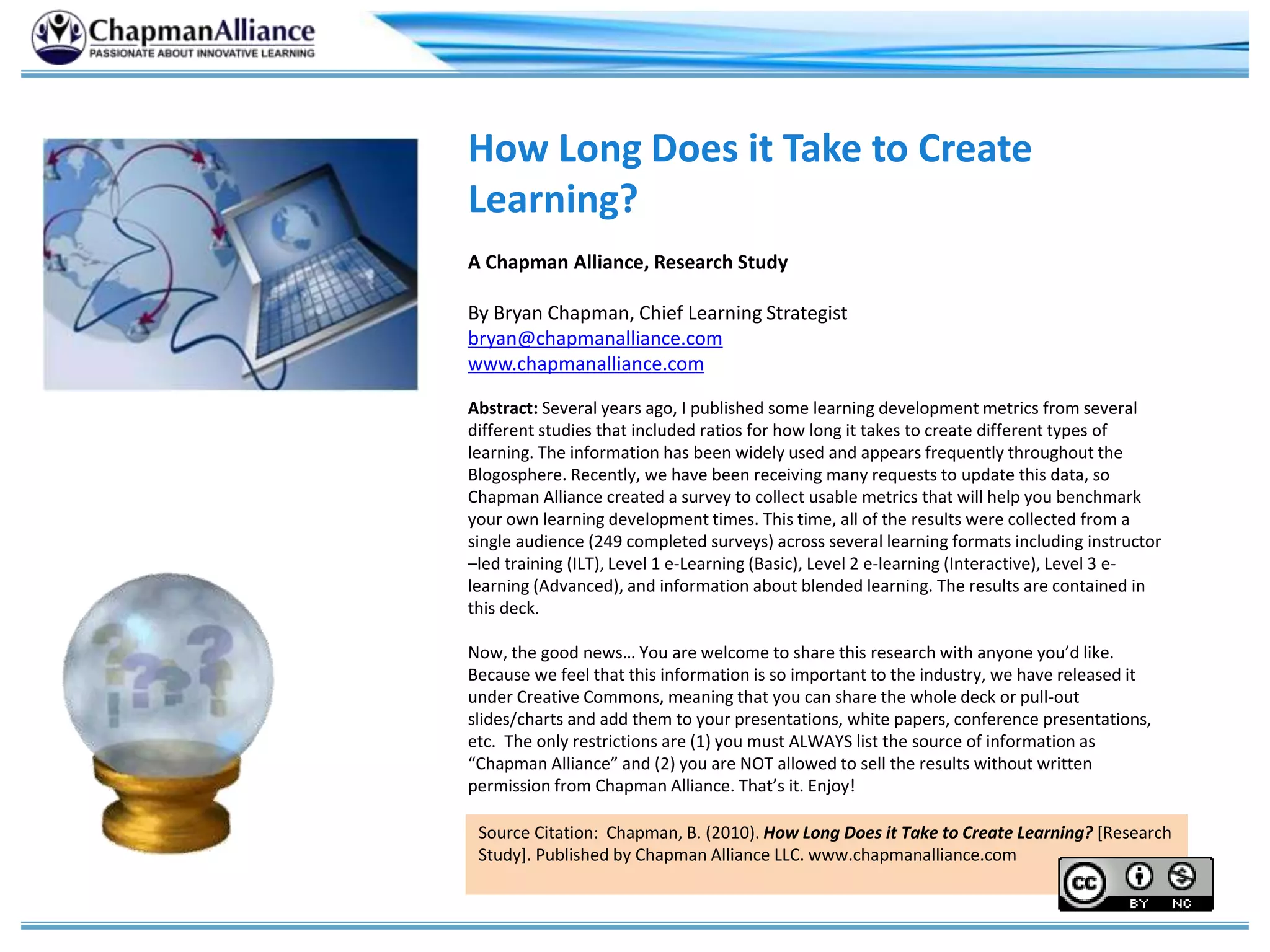 The study conducted by Chapman Alliance evaluates the time and costs involved in creating different types of learning content, including instructor-led training (ILT) and various levels of e-learning. Based on 249 completed surveys, average development times and costs are provided for ILT and levels 1, 2, and 3 of e-learning, with costs per finished hour ranging from $5,934 for ILT to $50,371 for level 3 e-learning. The study aims to give organizations benchmarking data for their own learning development projects.