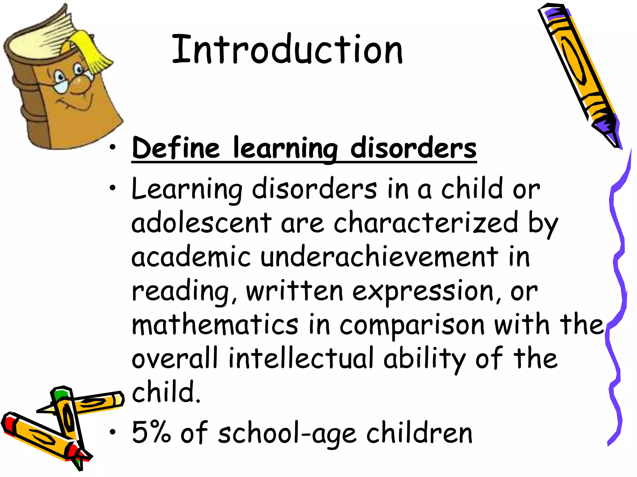 The document defines and discusses several types of learning disorders: reading disorder, mathematics disorder, and disorder of written expression. It provides details on the diagnostic criteria, epidemiology, etiology, clinical features, comorbidities, diagnosis, differential diagnosis, and treatment of each disorder based on the DSM-IV-TR. It also discusses a category of learning disorder not otherwise specified for problems that do not meet the criteria for a specific learning disorder but still significantly interfere with academic achievement.