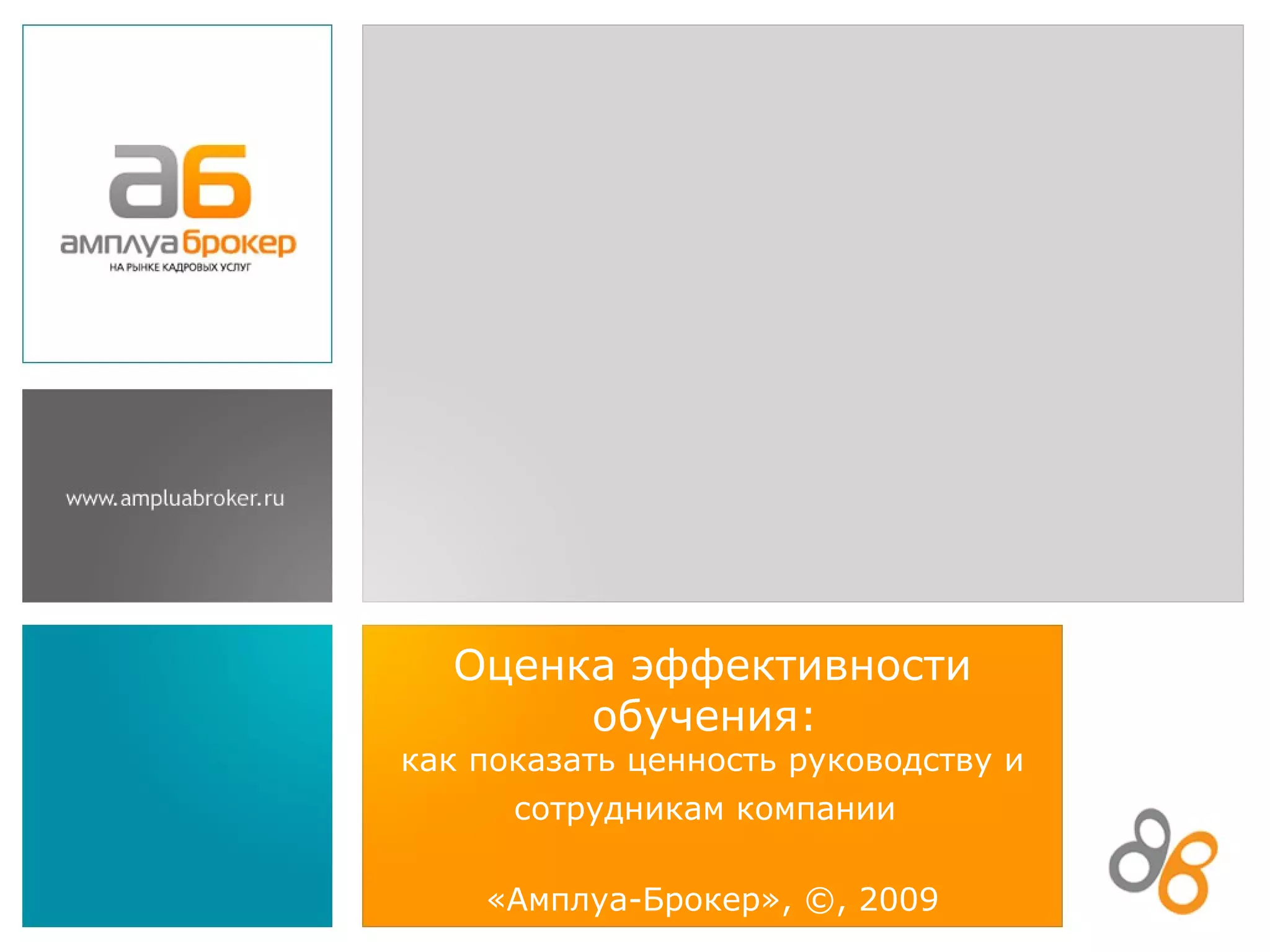 Барьеры при оценкеэффективности Сложность инструментов оценк и Отсутствие знаний как построить процесс Отсутствие ресурсов Отсутствие поддержки со стороны руководств а Отсутствие бюджета Отсутствие интереса к измерению в компании Отсутствие автоматизированного процесса Отсутствие согласия между топ менеджерами и отделом обучения что и как измерять Какой барьер самый весомый в вашей компании? По данным опроса www.Trainings.ru в августе 2009 году – «Отсутствие знаний, как построить процесс»