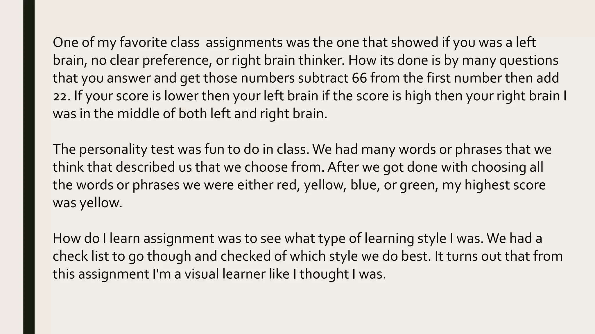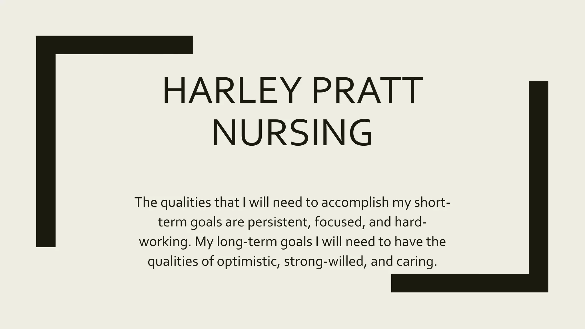 Harley Pratt is pursuing nursing and identifies qualities needed for short and long-term goals. They enjoyed a personality test that identified them as a yellow personality type and a visual learner. Favorite assignments included journal entries that helped them reflect on problems, goals, and how to improve support systems. The service learning project where they helped elderly residents had a strong impact by showing how a few hours can greatly help others. They reflect on personal growth in taking responsibility and overcoming self-doubt to achieve their dream of becoming a nurse.
