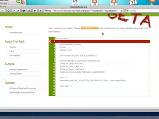 The document presents data from a study involving 6,000 software projects at Saarland University, focusing on the challenges of formal specifications in programming and the properties of various programming languages. It highlights the significant number of PhD advisors and students involved, alongside details about graduates, stipends, and the complexity of verifying secure protocols. The findings also cover the use of temporal properties and the prevalence of defects or code smells in software development.