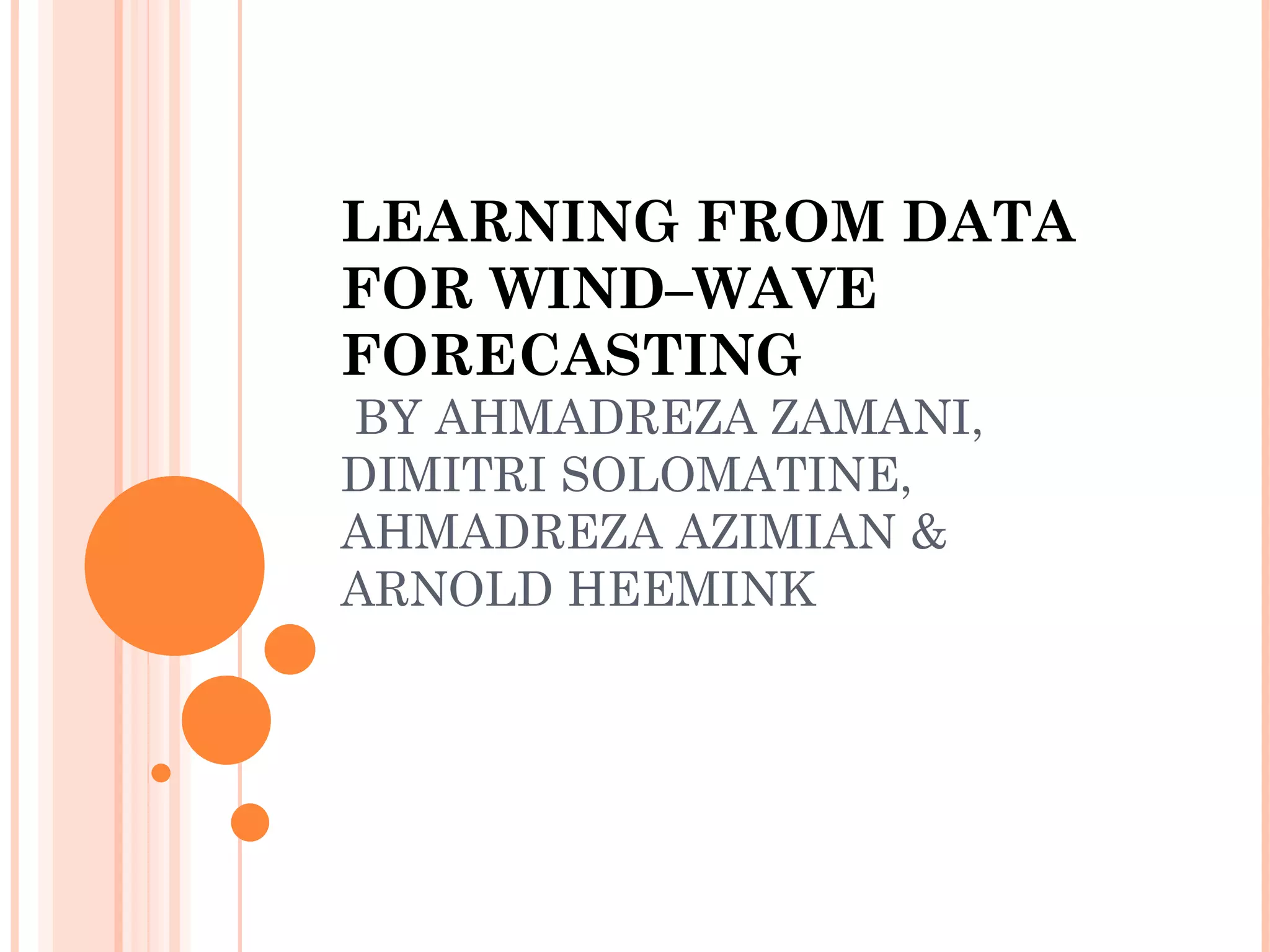 This study used artificial neural networks (ANNs) and instance-based learning (IBL) models to forecast significant wave heights 1, 3, and 6 hours ahead using wind and wave data from buoys located in the Caspian Sea. The ANNs performed slightly better than the IBL models. The models performed better at a deep water location compared to a shallow water location near the coast, where other environmental factors may influence wave patterns beyond wind conditions alone. While the data-driven methods showed potential, more comprehensive historical data could improve the accuracy of wind-wave forecasting in the Caspian Sea region.