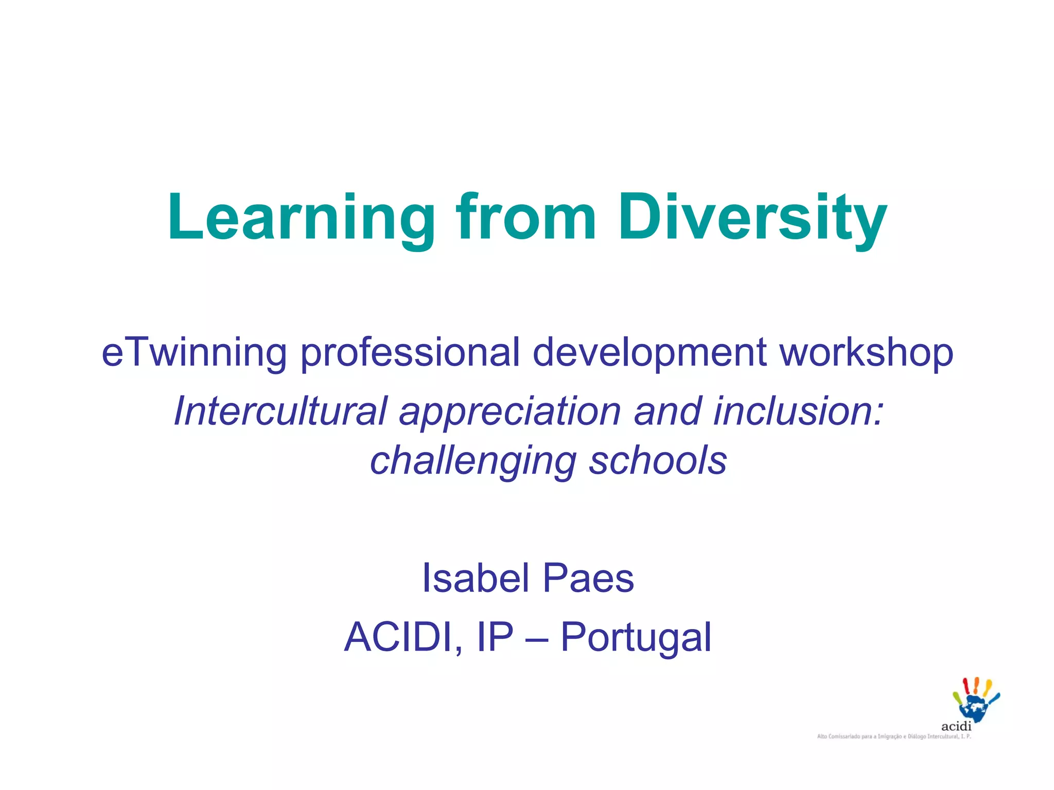This document discusses creating more inclusive schools through intercultural learning and appreciation of diversity. It emphasizes shifting from seeing differences as problems to opportunities for learning, collaboration, and changing together. Key strategies discussed include developing intercultural skills through critical reflection, collaborative inquiry into the school context to understand barriers, and using evidence to stimulate organizational change. The goal is increasing participation of all students through more welcoming, cooperative learning environments and removing obstacles in both school structures and people's minds.