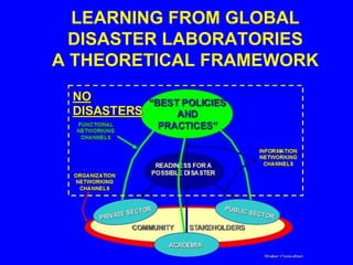 The document outlines a theoretical framework for understanding and improving disaster resilience through interdisciplinary dialogue, focusing on the intersections of people, communities, and recurring natural events. It emphasizes the importance of preparedness, knowledge sharing, and closing gaps in understanding to effectively manage the risks of disasters. The goal is to implement best practices and policies that enhance community resilience and reduce vulnerabilities.