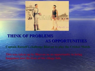 The document provides lessons in leadership based on the film Lagaan. It discusses how Bhuvan viewed the cricket match as an opportunity to bring happiness to his village. He dreamed big by aiming to win tax exemption for 3 years and developed a strategic plan. He was determined in the face of opposition from the village and his team. He simplified cricket and motivated his team through examples. He innovated by creating tools from local resources. Small early wins built motivation. He built his team through selection and motivation of individual strengths. He supported his team through mistakes. Passion and hard work through training and practice led to never giving up and winning through team spirit and ordinary people achieving extraordinary goals.