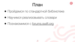 Документ представляет собой обучающий материал по языку программирования Swift, охватывающий темы стандартной библиотеки, работы со словарями, хешированием и различными структурами данных. Рассматриваются алгоритмы, такие как Robin-Hood hashing и strategies сортировки, а также использование новых коллекций в Swift 5.0 и методах для управления данными в UITableView, включая использование diffable data sources.