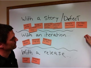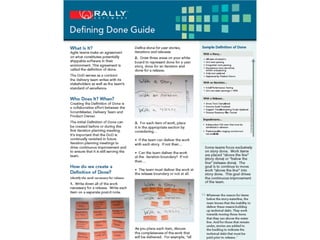 The document discusses the use of burndown charts for team improvement in agile methodologies. It emphasizes the importance of defining completion criteria and addressing technical debt, while also promoting a shift from waterfall to iterative processes. Retrospectives are suggested to further enhance delivery and team performance.