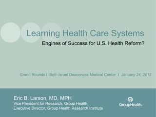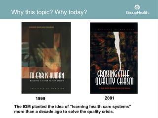 The document discusses the concept of learning health care systems (LHCS) as a potential solution to the ongoing challenges in the U.S. health care system, including issues of quality, access, and cost. It highlights the Group Health Cooperative as a successful model of LHCS that integrates research and clinical practice, demonstrating improvements in patient care and cost efficiency. The document also outlines various initiatives and research efforts aimed at reducing waste and enhancing patient-centered care within the healthcare framework.