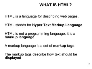 The document provides an introduction to HTML (Hypertext Markup Language), covering basic HTML tags and elements used to structure and format text on web pages. It explains that HTML is not a programming language but a markup language used to define the structure of a web page. The document lists common HTML tags for headings, paragraphs, line breaks, comments, and other text elements, and provides examples of how each tag is structured and displayed in a web browser. It also covers attributes that provide additional styling information for elements.