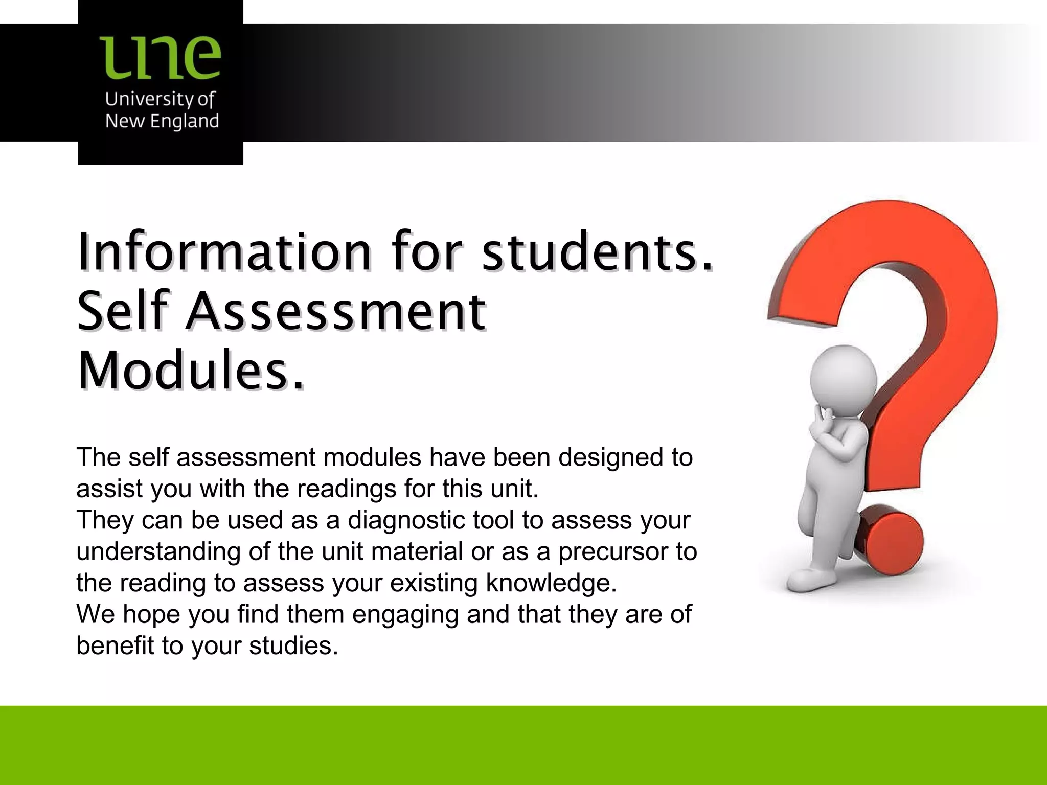 The self assessment modules are designed to help students test their understanding of course readings for each week. They consist of 3 multiple choice questions per topic, with feedback provided. If a question is answered incorrectly, students are directed to re-read that section. The modules include images, audio, video and other media to engage students. Student usage of the modules will be analyzed and a survey conducted to help improve them.