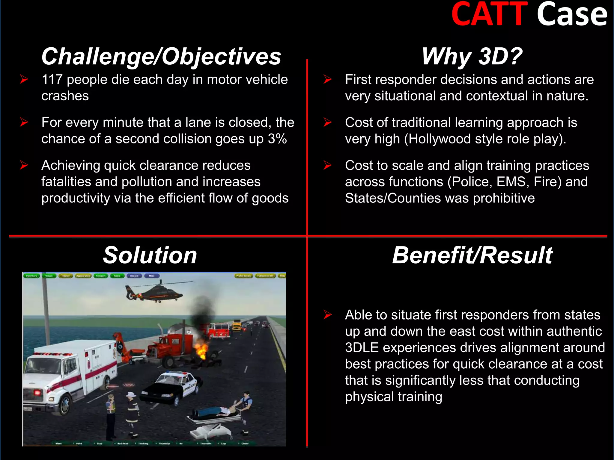 The document outlines the benefits of 3D learning experiences in various case studies, highlighting its efficacy in diversity training, inventory observations, museum exhibitions, first responder training, and corporate graduate programs. It demonstrates how 3D learning can enhance engagement, reduce costs, and improve knowledge retention compared to traditional learning approaches. Additionally, it provides a structured framework for implementing immersive learning experiences across different sectors.