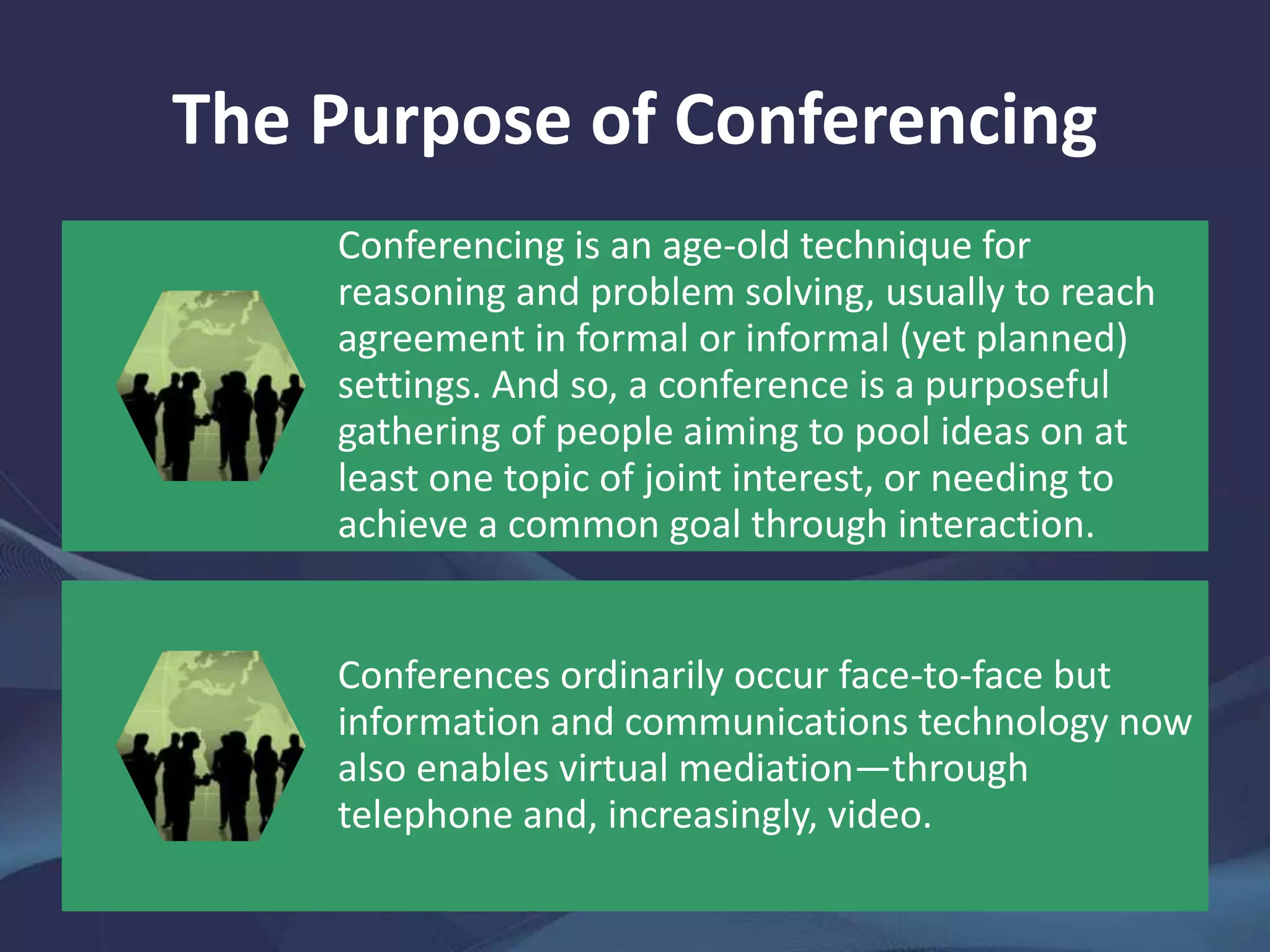 The document summarizes different types of conferences and their purposes, including conventions, forums, seminars, workshops, and retreats. It notes that while conferences are widely used, their evaluations typically only assess participant satisfaction and not learning outcomes or impacts. The document calls for conference evaluations to assess learning at deeper levels, including new behaviors and results, using frameworks like Kirkpatrick's four levels of learning evaluation. It contrasts the characteristics of traditional evaluation with a "New Learning" approach focused more on understanding than judgment.