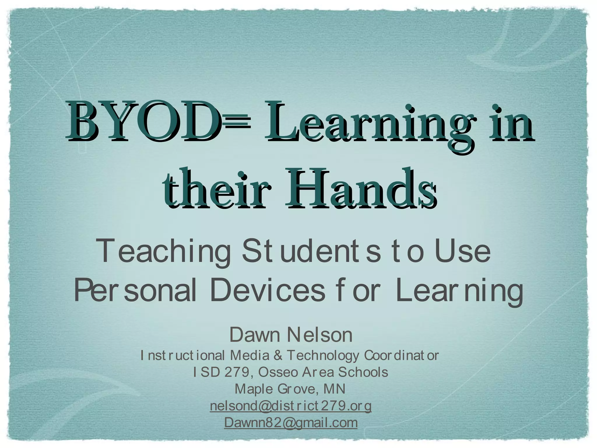 This document discusses a school district's journey with BYOD (Bring Your Own Device). Some key points: