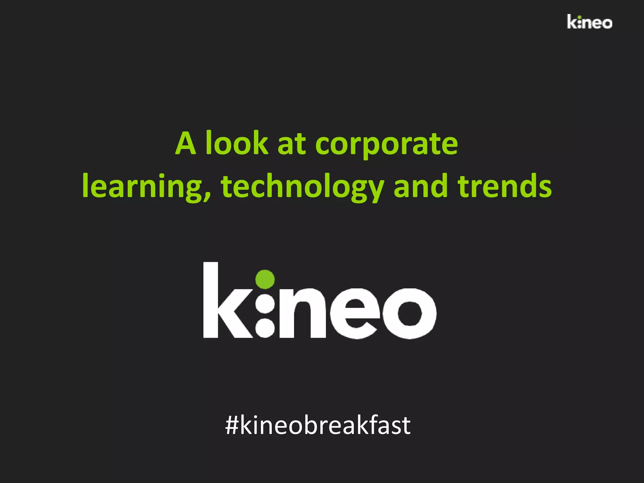 The document discusses the future of corporate learning and technology trends, emphasizing the importance of pervasive, continuous, and collaborative learning. It highlights challenges such as the need for adaptive and personalized learning approaches, the role of line managers, and the transformative impact of technology, particularly social and informal learning. Key recommendations include fostering a culture of learning, improving empathy in experiences, and leveraging technology to enhance assessment and adaptability in learning environments.