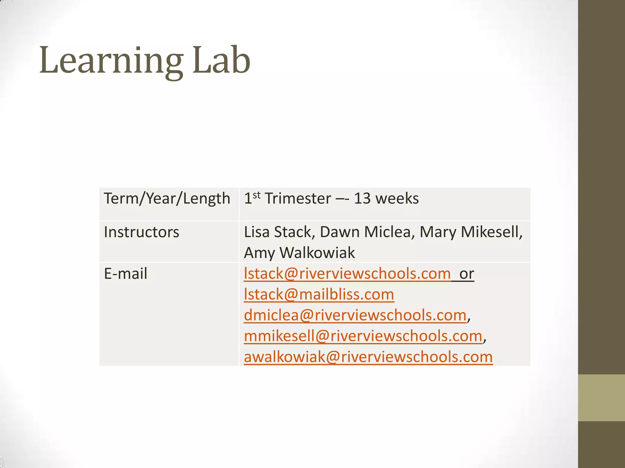 This document summarizes a Learning Lab course for a trimester. The course aims to provide academic support for students and teach study skills. It is taught by four instructors and meets daily for 13 weeks. Students are graded based on daily logs, maintaining a student planner, turning in weekly signed grade sheets, and a final exam paper. These assignments make up 80% of the course grade, while a final exam makes up the remaining 20%.