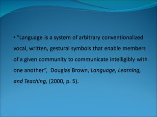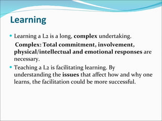 This document discusses language learning and teaching. It defines language as a systematic set of symbols used for communication within a community. Learning a second language is a complex, long-term process that requires total mental and physical commitment. Teaching a second language involves facilitating the learning process by understanding the various issues that affect how and why people learn languages. These issues include linguistic features, cognition, sociolinguistics, and more. The philosophy of education influences the teaching style, approach, methods, and techniques used in the classroom. Effective teaching reflects an understanding of oneself and helps students learn.
