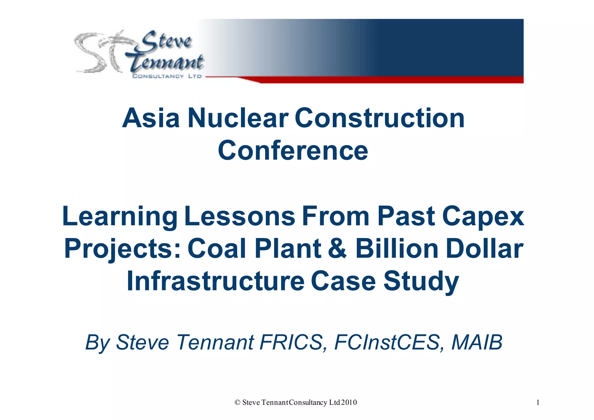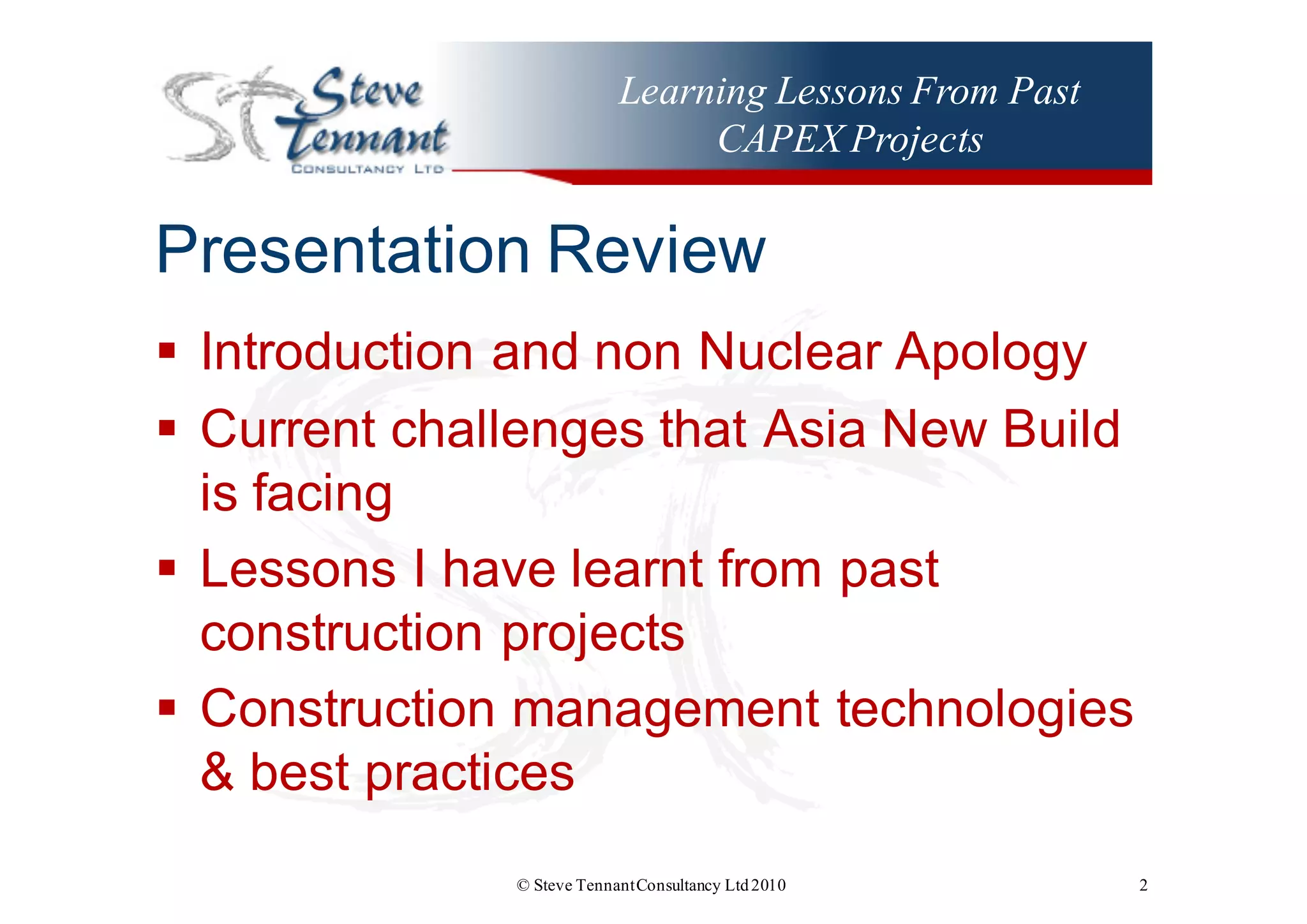 The document discusses lessons learned from past large construction projects that could help reduce risks and costs for new nuclear power plant projects in Asia. It summarizes the current challenges facing nuclear new builds in Asia, including sourcing experienced personnel. It then outlines several construction management best practices and technologies that were used successfully on other large infrastructure projects, such as building information modeling (BIM) and using an owner's project management team to speed up decision making. The presentation aims to provide suggestions for controlling complex builds in unpredictable environments and reducing time and risk exposure for the next billion dollar project.