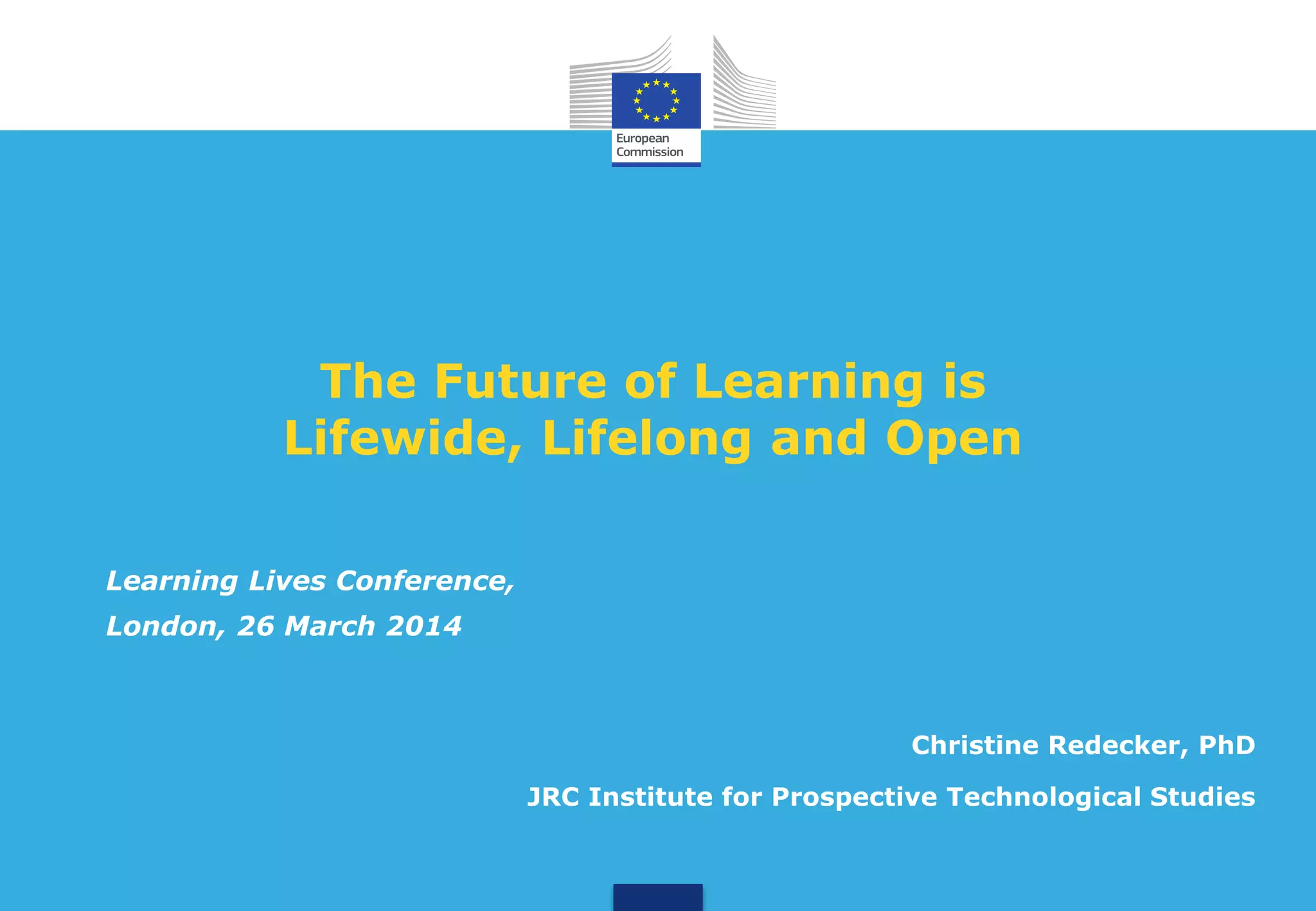 The document discusses the future of learning and how it will be lifewide, lifelong, and open. It notes that learning will be more personalized, flexible, interactive, and learner-centered. Formal education may become more informal as learning shifts to homes, workplaces, and communities. Technologies will play an important role in enabling new forms of learning. Institutions, teachers, and methods of assessment will need to change and adapt to these new realities. Overall, the future of learning is envisioned as being more open, social, and learner-driven.