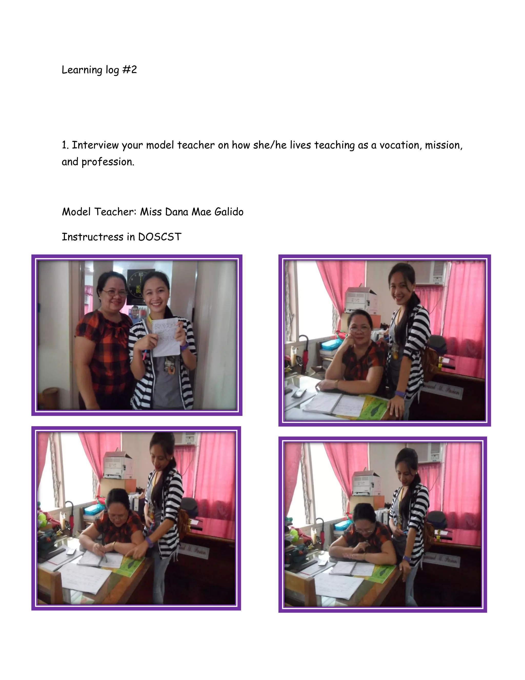 1. The model teacher, Miss Dana Mae Galido, views teaching as a calling to bring about positive change in students' lives, as a choice of profession that allows for personal growth, and as a mission to be responsible and give her best as an instructor.